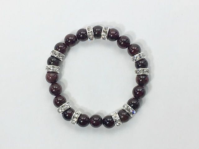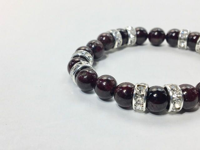 こちらは、8mm玉のガーネットを使ったパワーストーンブレスレットです。シンプルなデザインでどんなコーディネートにも合わせやすいデザインに仕上げています。サイズは内周約14cmです。気になる方は是非この機会にどうぞ。