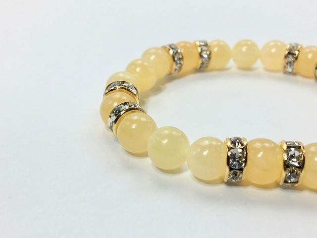 こちらは、8mm玉のアラゴナイトを使ったパワーストーンブレスレットです。シンプルなデザインでどんなコーディネートにも合わせやすいデザインに仕上げています。サイズは内周約15cmです。気になる方は是非この機会にどうぞ。