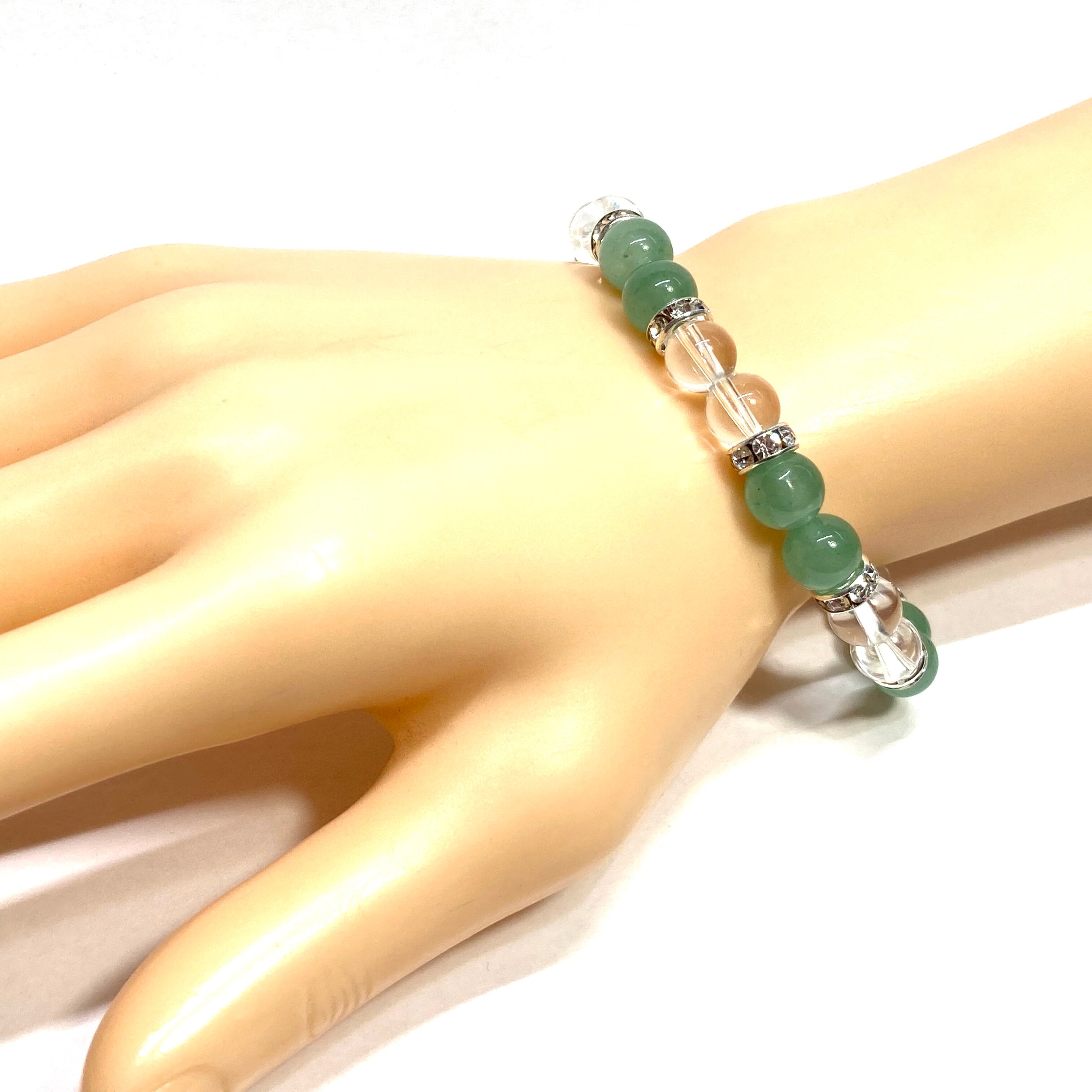 こちらは、8mm玉のアベンチュリンと水晶を使用した天然石ブレスレットです。石との間に挟まれたロンデルがアクセントになったデザインです。サイズは内周約15cmです。
