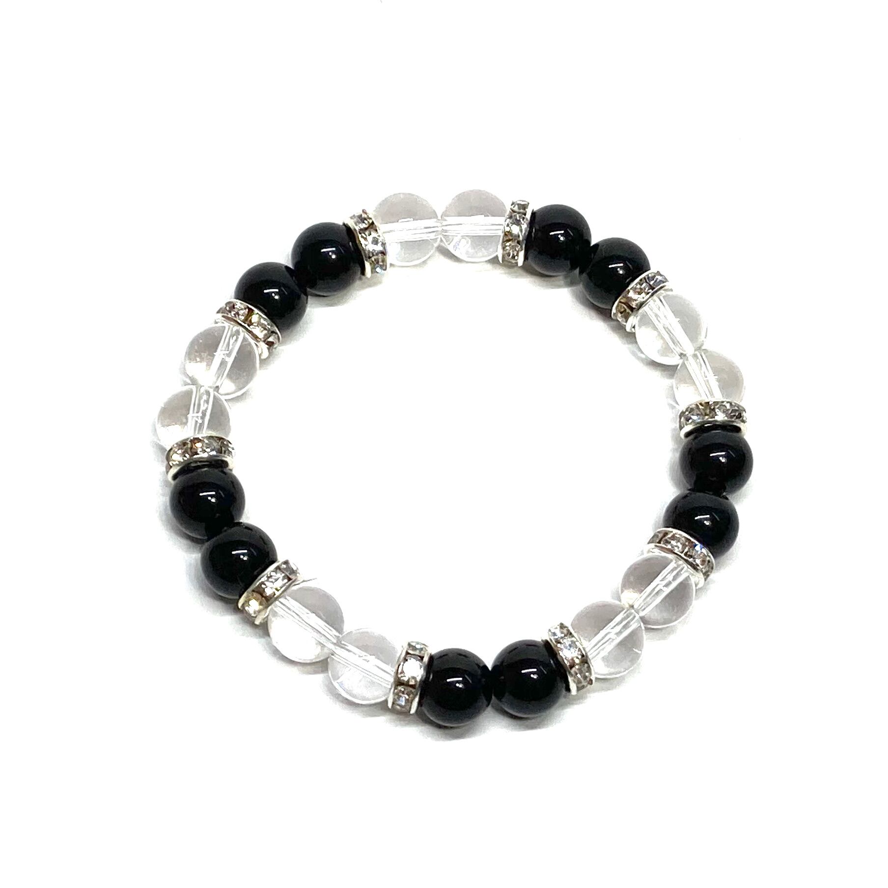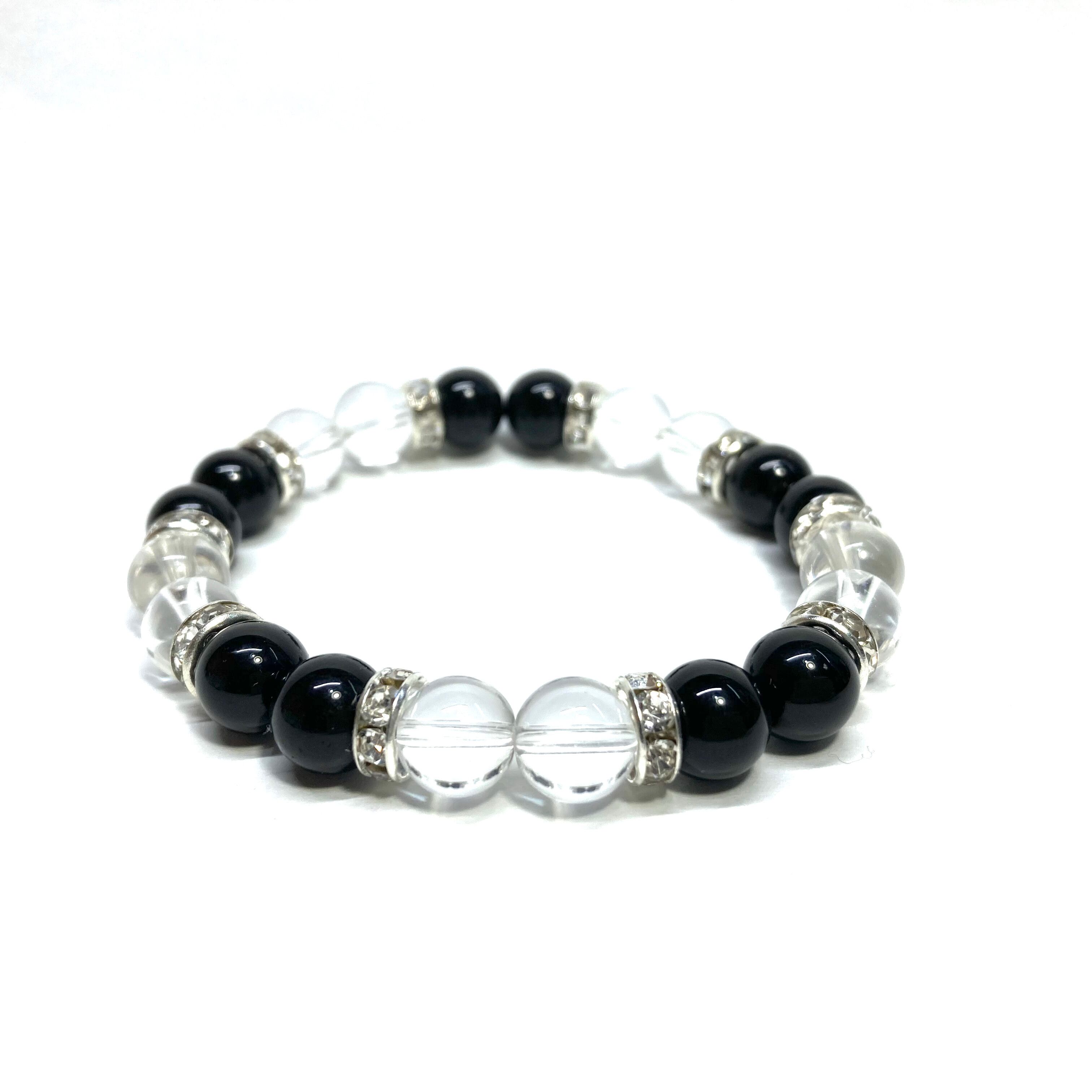 こちらは、8mm玉のブラックスピネルと水晶を使用した天然石ブレスレットです。石との間に挟まれたロンデルがアクセントになったデザインです。サイズは内周約15cmです。