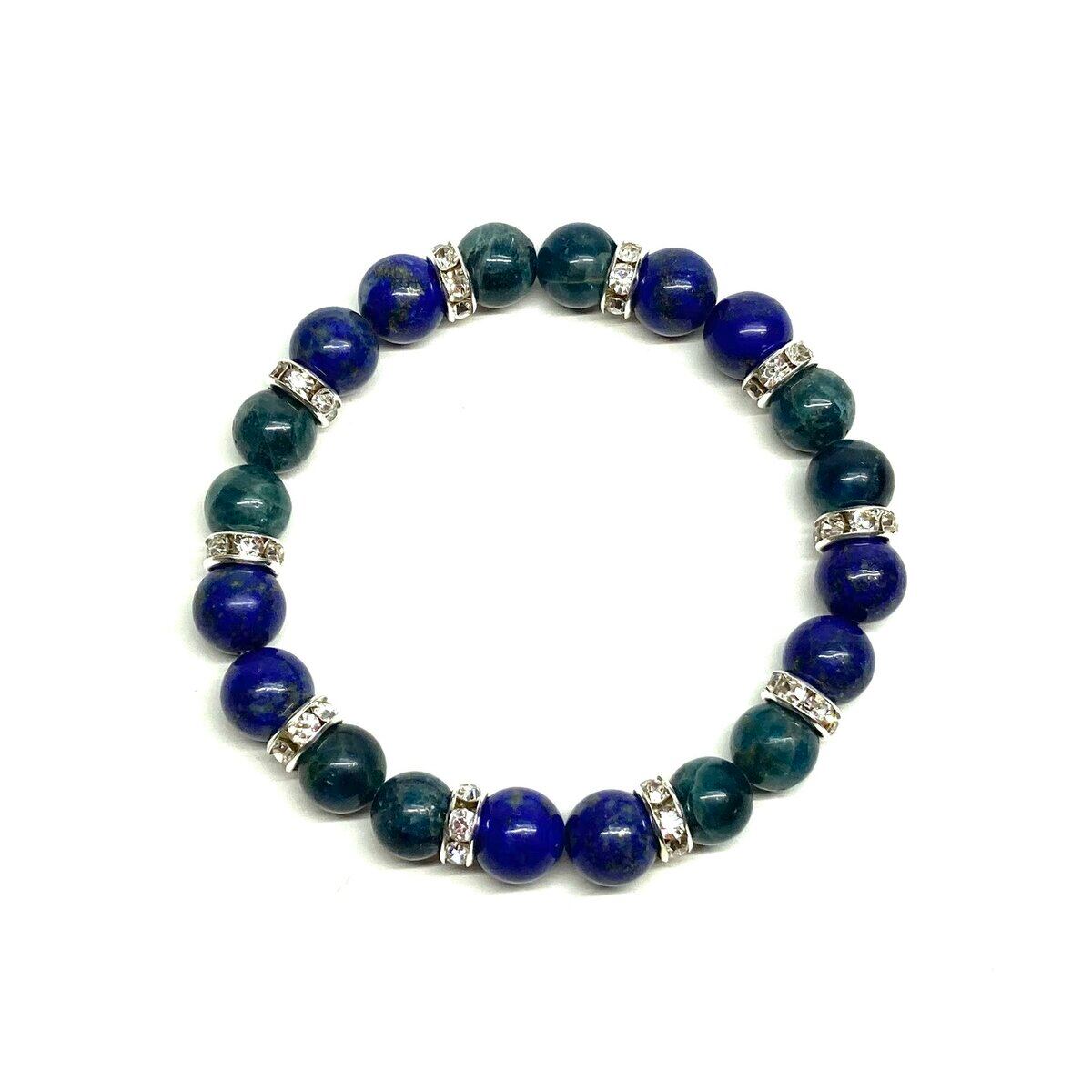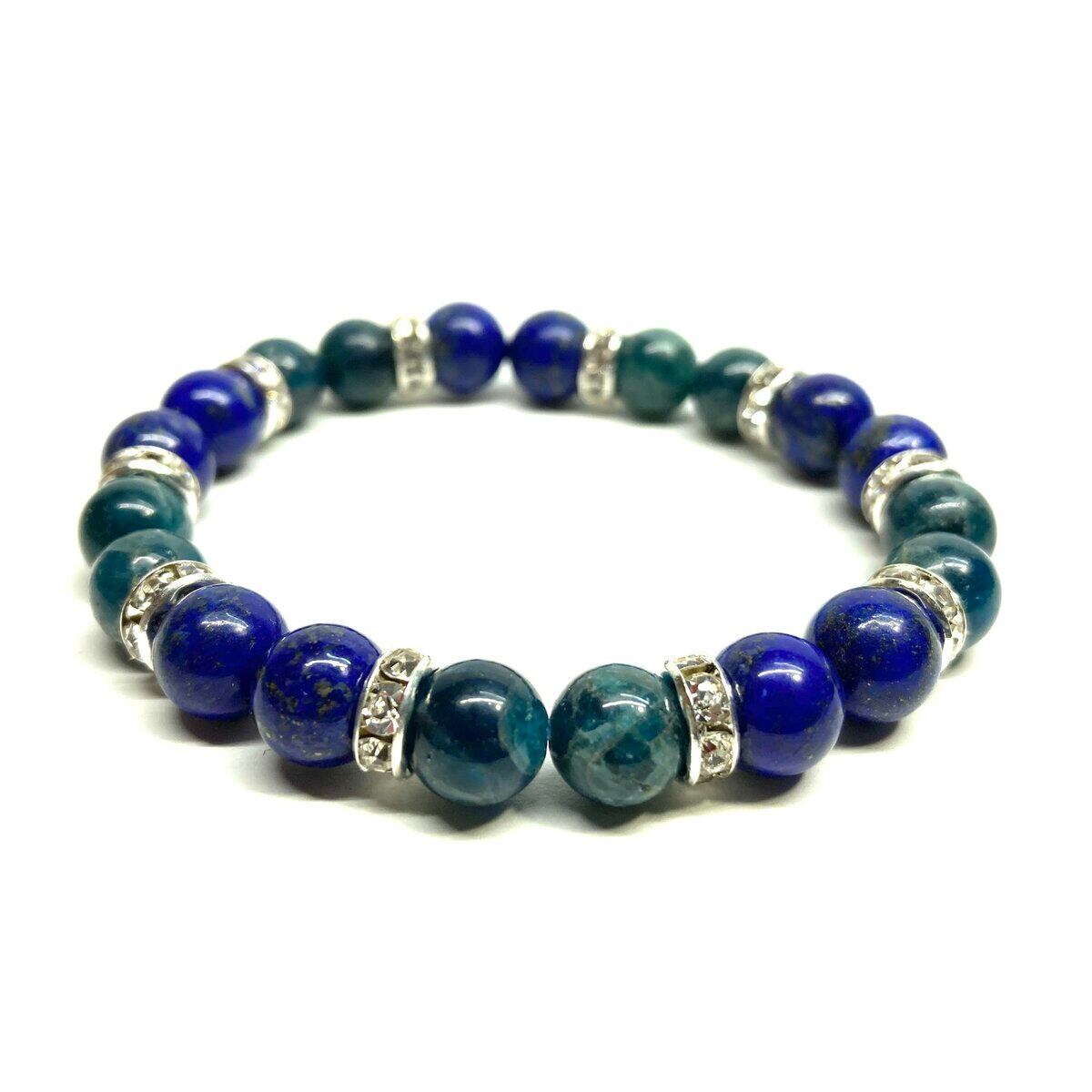 こちらは、8mm玉のラピスラズリとアパタイトを使ったパワーストーンブレスレットです。シンプルなデザインでどんなコーディネートにも合わせやすいデザインに仕上げています。サイズは内周 約15cmです。気になる方は是非この機会にどうぞ。