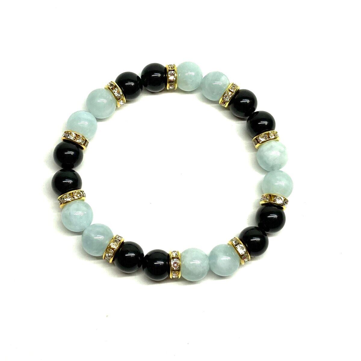 こちらは、8mm玉のモリオンとアクアマリンを使ったパワーストーンブレスレットです。シンプルなデザインでどんなコーディネートにも合わせやすいデザインに仕上げています。サイズは内周 約15cmです。気になる方は是非この機会にどうぞ。