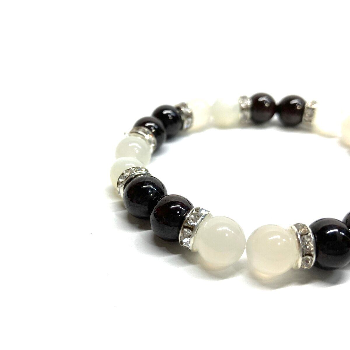 こちらは、8mm玉のムーンストーンとガーネットを使ったパワーストーンブレスレットです。シンプルなデザインでどんなコーディネートにも合わせやすいデザインに仕上げています。サイズは内周 約15cmです。気になる方は是非この機会にどうぞ。
