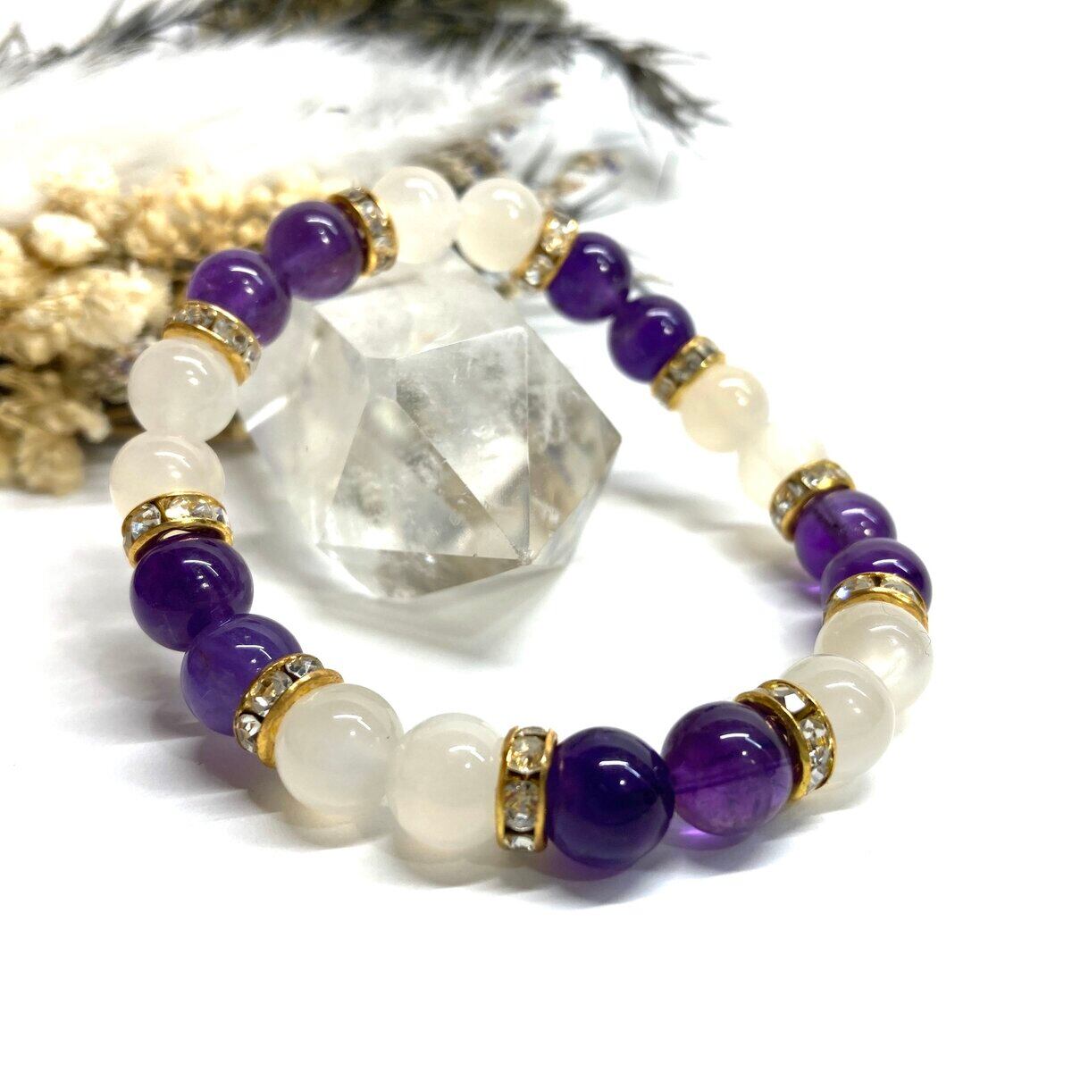 こちらは、8mm玉のムーンストーンとアメジストを使ったパワーストーンブレスレットです。シンプルなデザインでどんなコーディネートにも合わせやすいデザインに仕上げています。サイズは内周 約15cmです。気になる方は是非この機会にどうぞ。