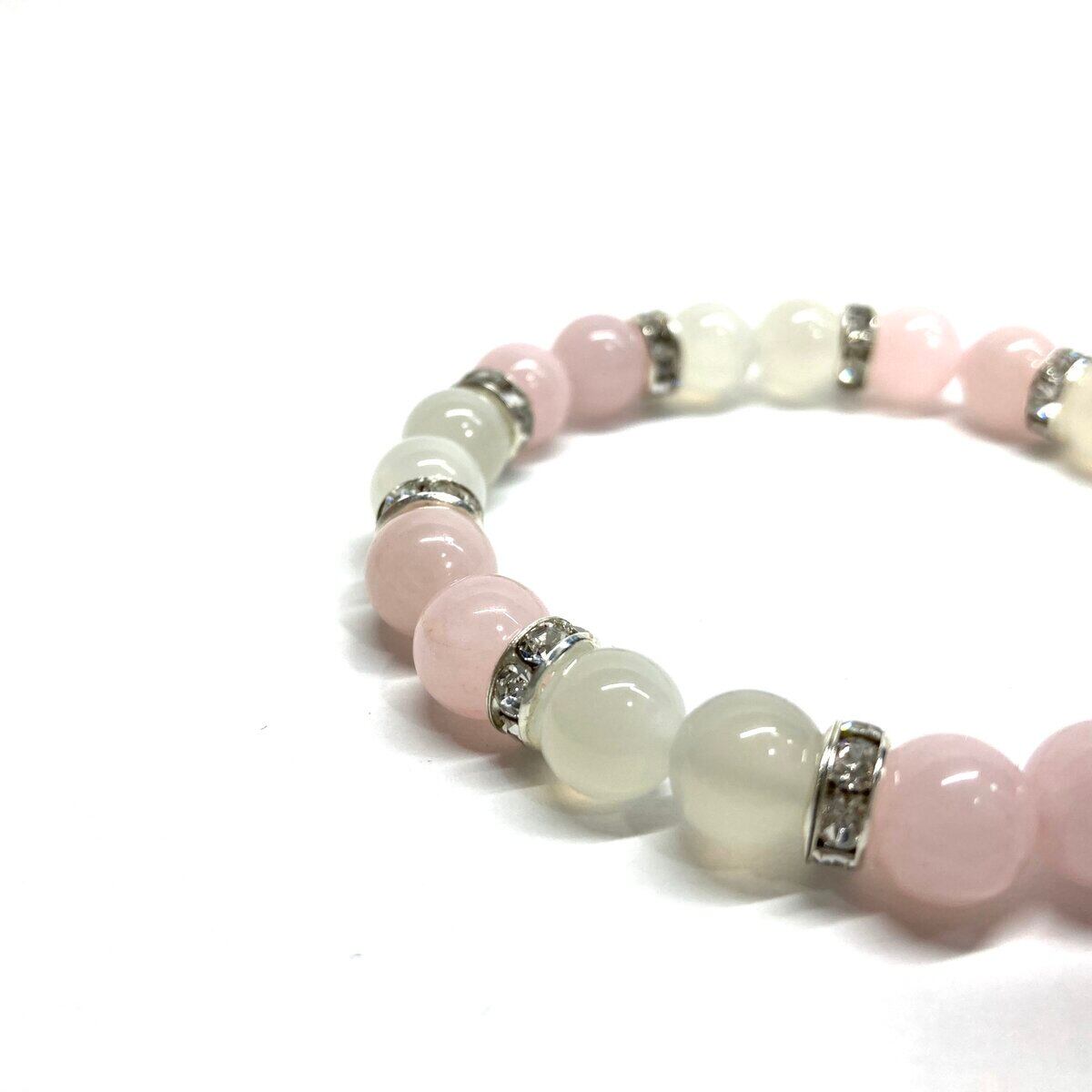 こちらは、8mm玉のムーンストーンとローズクォーツを使ったパワーストーンブレスレットです。シンプルなデザインでどんなコーディネートにも合わせやすいデザインに仕上げています。サイズは内周 約15cmです。気になる方は是非この機会にどうぞ。