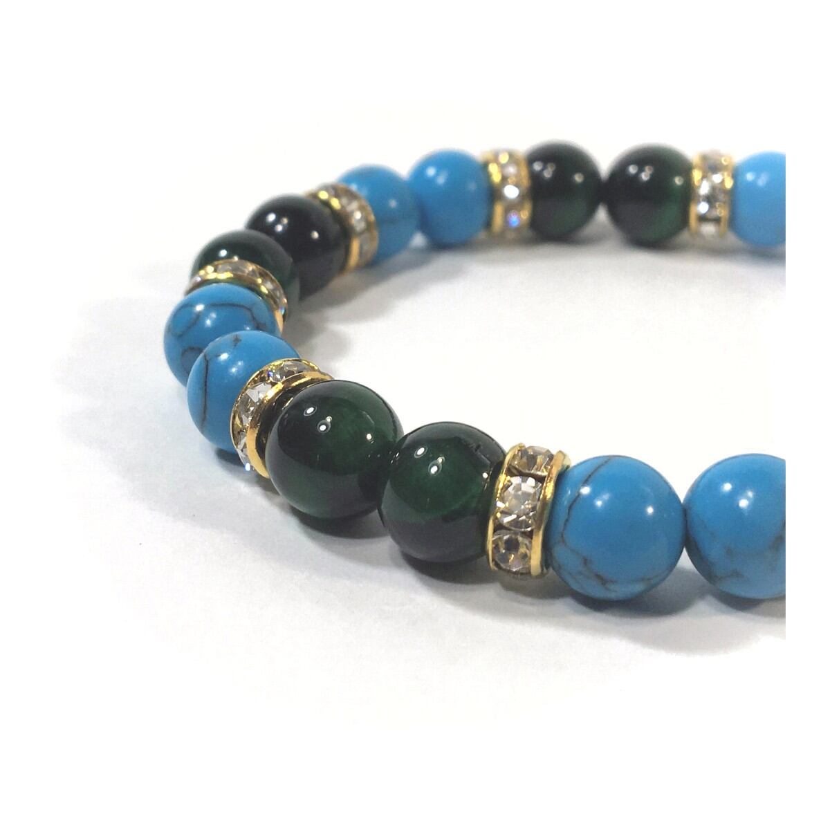 こちらは、8mm玉のターコイズとグリーンタイガーアイを使ったパワーストーンブレスレットです。シンプルなデザインでどんなコーディネートにも合わせやすいデザインに仕上げています。サイズは内周約15cmです。気になる方は是非この機会にどうぞ。