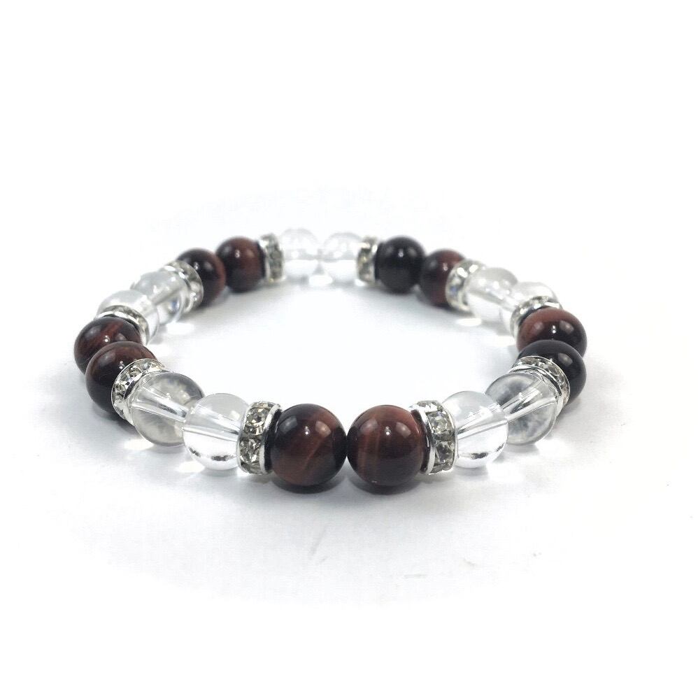 こちらは、8mm玉の水晶とレッドタイガーアイを使ったパワーストーンブレスレットです。シンプルなデザインでどんなコーディネートにも合わせやすいデザインに仕上げています。サイズは内周約15cmです。気になる方は是非この機会にどうぞ。