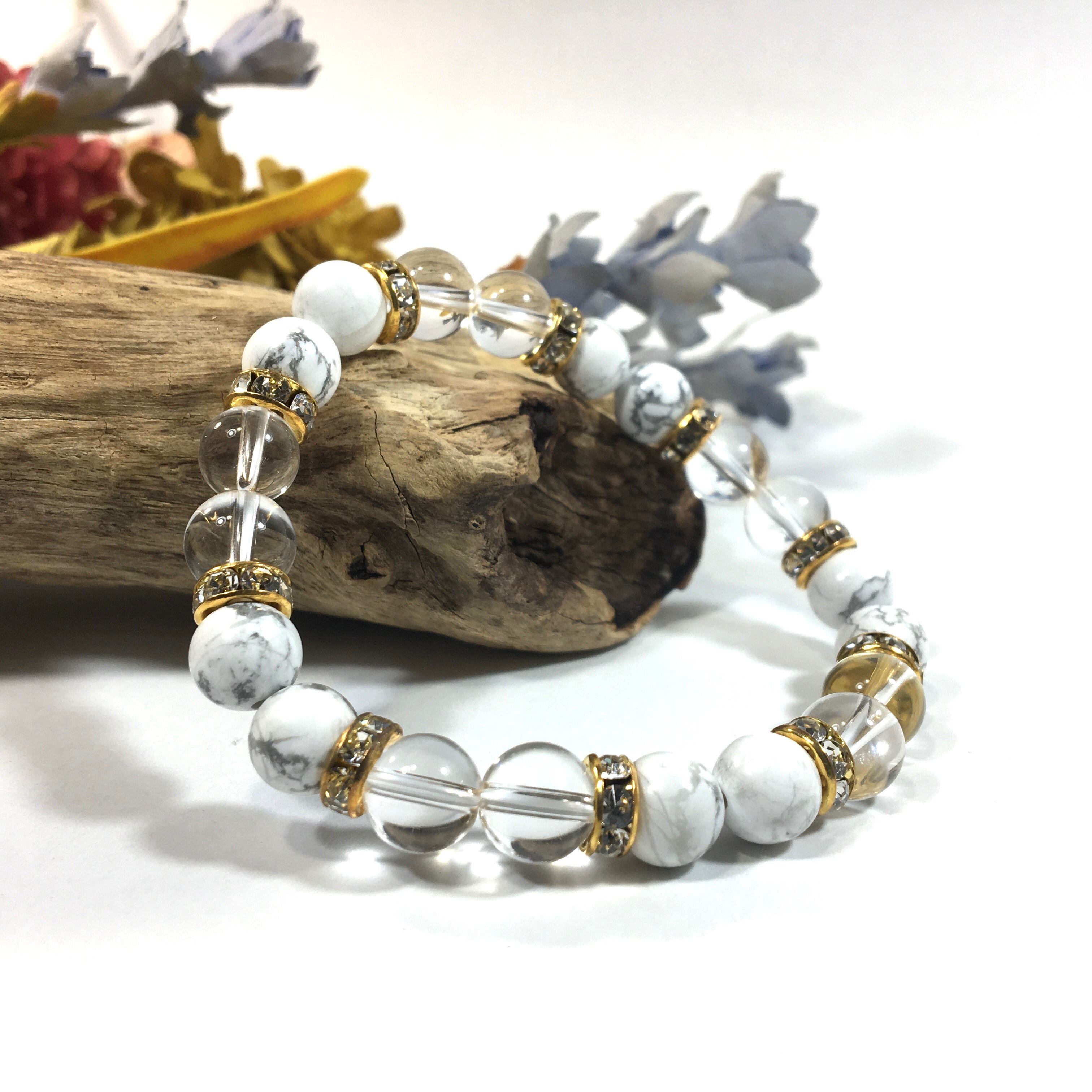水晶&ハウライト パワーストーン ブレスレット 天然石 8mm(ゴールド)レディース 女性 数珠ブレス 開運 プレゼント ギフト