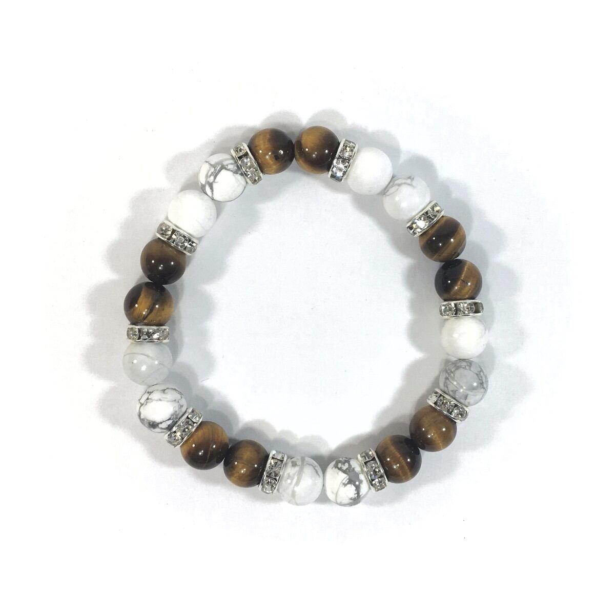 こちらは、8mm玉のハウライトとタイガーアイを使ったパワーストーンブレスレットです。シンプルなデザインでどんなコーディネートにも合わせやすいデザインに仕上げています。サイズは内周約15cmです。気になる方は是非この機会にどうぞ。