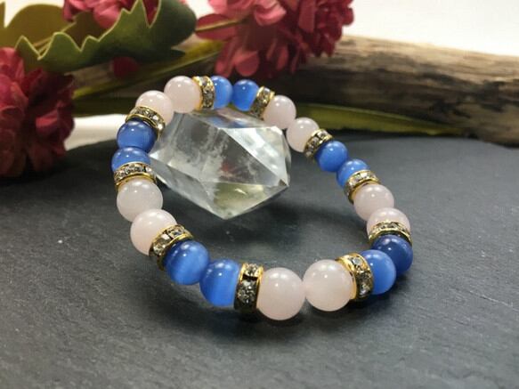 こちらは、8mm玉のブルーキャッツアイとローズクォーツを使用したパワーストーンブレスレットです。間にはロンデルを挟み高級感ある大人っぽいデザインに仕上がっています。サイズは内周約15cmです。気になる方は是非この機会にどうぞ。