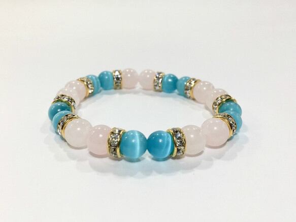 こちらは、8mm玉のライトブルーキャッツアイとローズクォーツを使用したパワーストーンブレスレットです。間にはロンデルを挟み高級感ある大人っぽいデザインに仕上がっています。サイズは内周約15cmです。気になる方は是非この機会にどうぞ。