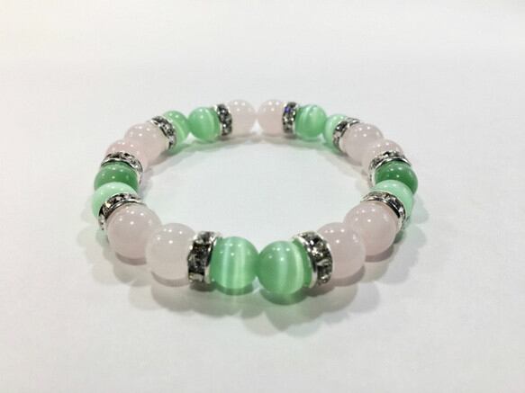 こちらは、8mm玉のライトグリーンキャッツアイとローズクォーツを使用したパワーストーンブレスレットです。間にはロンデルを挟み高級感ある大人っぽいデザインに仕上がっています。サイズは内周約15cmです。気になる方は是非この機会にどうぞ。