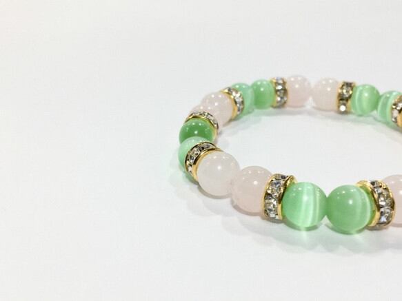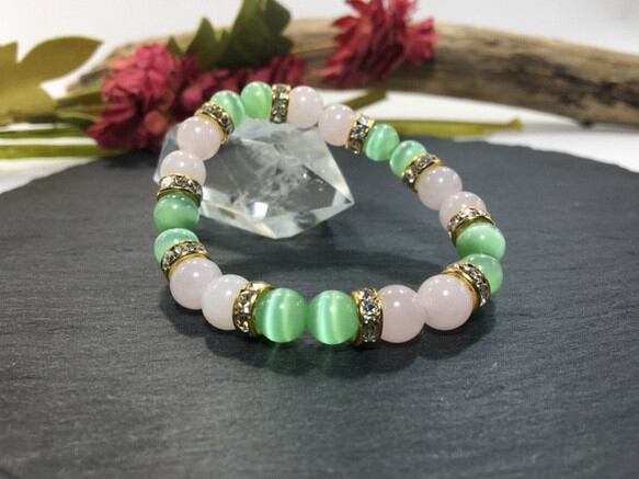 こちらは、8mm玉のライトグリーンキャッツアイとローズクォーツを使用したパワーストーンブレスレットです。間にはロンデルを挟み高級感ある大人っぽいデザインに仕上がっています。サイズは内周約15cmです。気になる方は是非この機会にどうぞ。