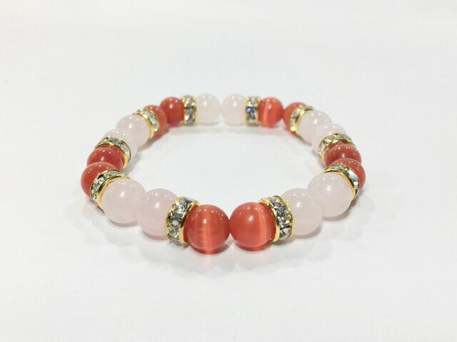 こちらは、8mm玉のレッドキャッツアイ(※オレンジに近い色合いです)とローズクォーツを使用したパワーストーンブレスレットです。間にはロンデルを挟み高級感ある大人っぽいデザインに仕上がっています。サイズは内周約15cmです。気になる方は是非この機会にどうぞ。