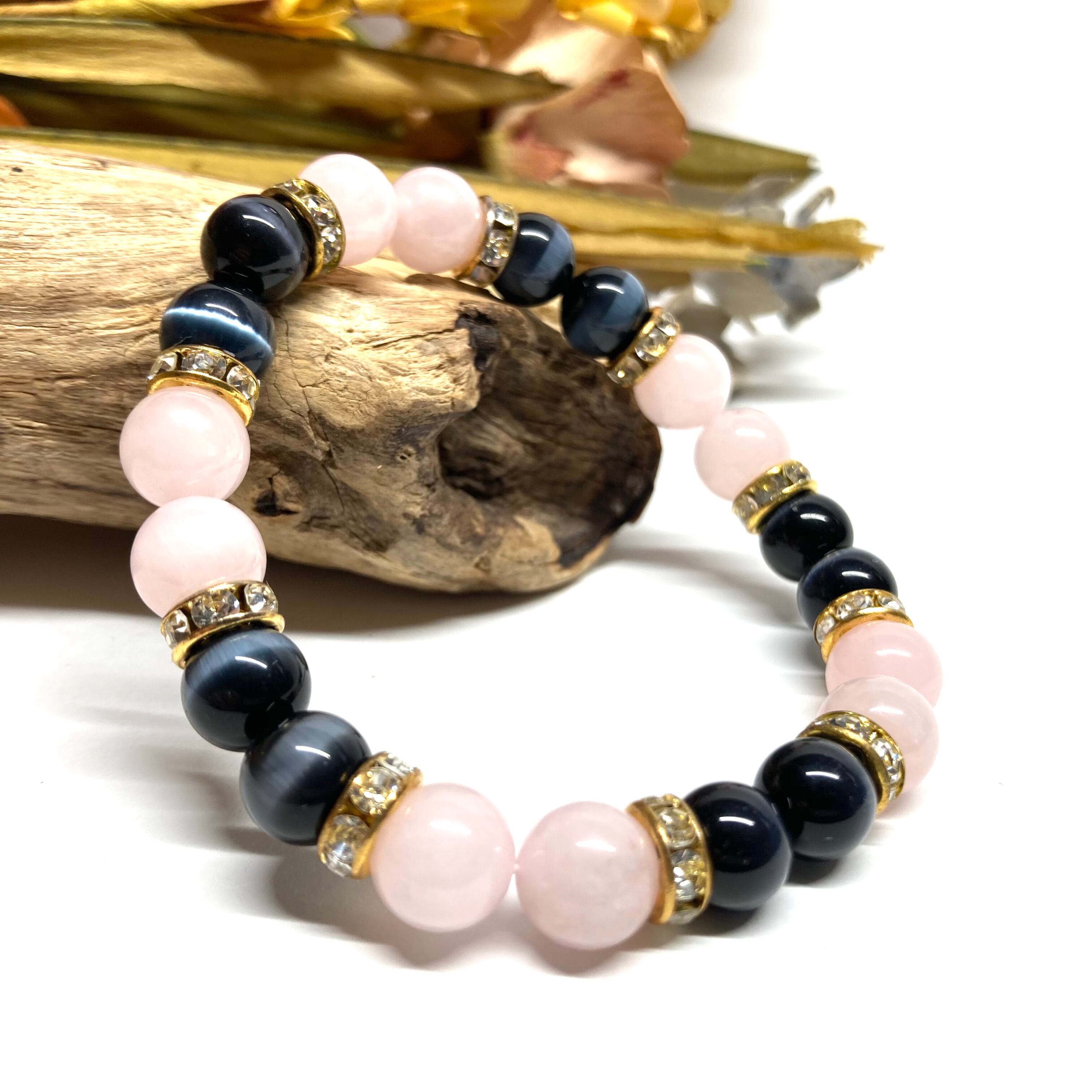 こちらは、8mm玉のブラックキャッツアイとローズクォーツを使用したパワーストーンブレスレットです。間にはゴールドのロンデルを挟み高級感ある大人っぽいデザインに仕上がっています。サイズは内周約15cmです。気になる方は是非この機会にどうぞ。
