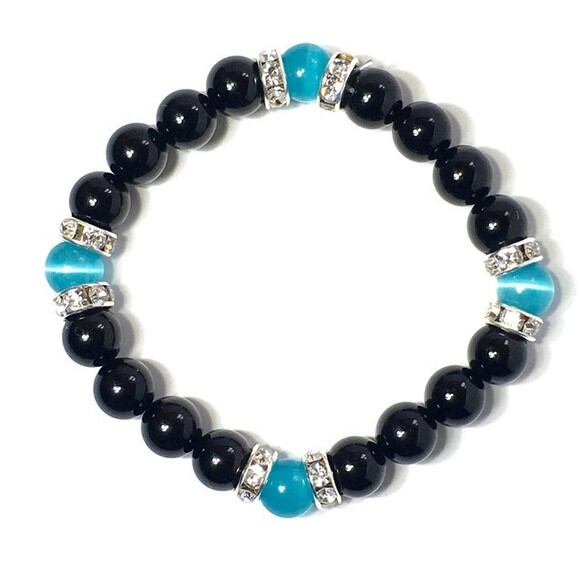 こちらは、8mm玉のライトブルーキャッツアイとオニキスを使用したパワーストーンブレスレットです。間にはシルバーのロンデルを挟み高級感ある大人っぽいデザインに仕上がっています。サイズは内周 約15cm(手首周りを測り少し余裕をもってお買い求めくださいませ。) です。気になる方は是非この機会にどうぞ。