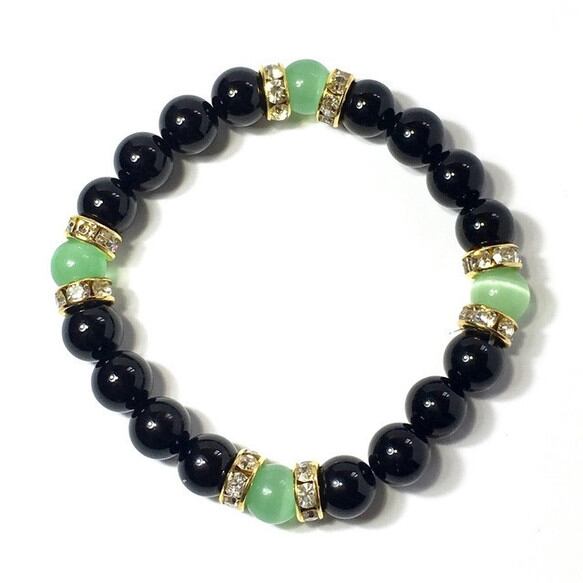 こちらは、8mm玉のライトグリーンキャッツアイとオニキスを使用したパワーストーンブレスレットです。間にはシルバーのロンデルを挟み高級感ある大人っぽいデザインに仕上がっています。サイズは内周 約15cm(手首周りを測り少し余裕をもってお買い求めくださいませ。) です。気になる方は是非この機会にどうぞ。