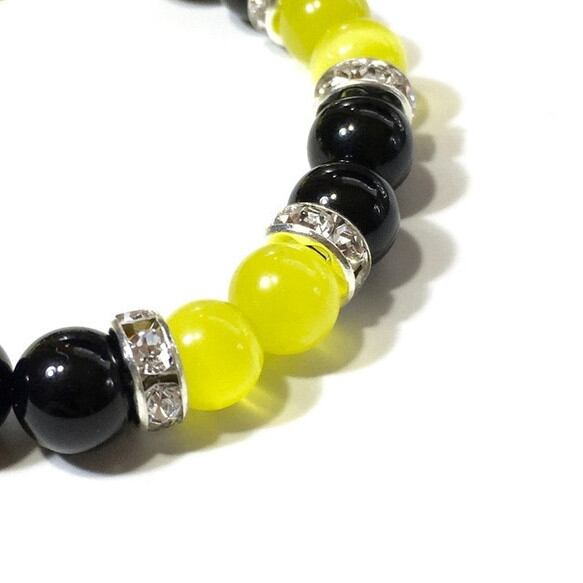 こちらは、8mm玉のイエローキャッツアイとオニキスを使用したパワーストーンブレスレットです。間にはシルバーのロンデルを挟み高級感ある大人っぽいデザインに仕上がっています。サイズは内周 約15cm(手首周りを測り少し余裕をもってお買い求めくださいませ。) です。気になる方は是非この機会にどうぞ。