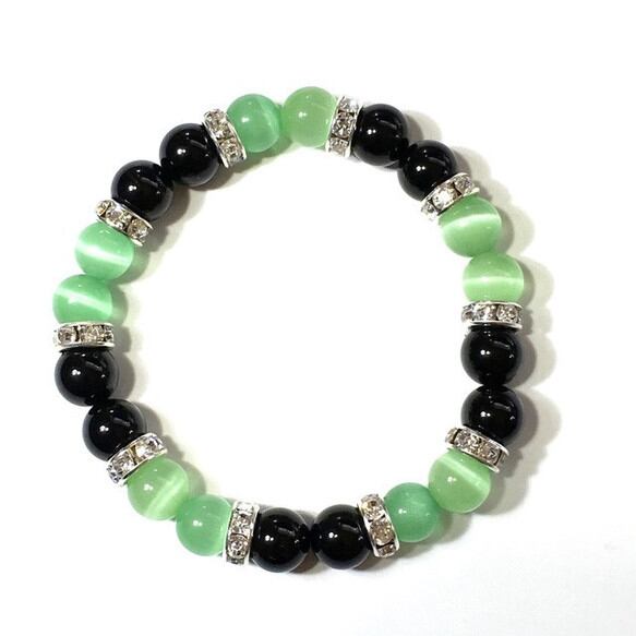 こちらは、8mm玉のライトグリーンキャッツアイとオニキスを使用したパワーストーンブレスレットです。間にはシルバーのロンデルを挟み高級感ある大人っぽいデザインに仕上がっています。サイズは内周 約15cm(手首周りを測り少し余裕をもってお買い求めくださいませ。) です。気になる方は是非この機会にどうぞ。