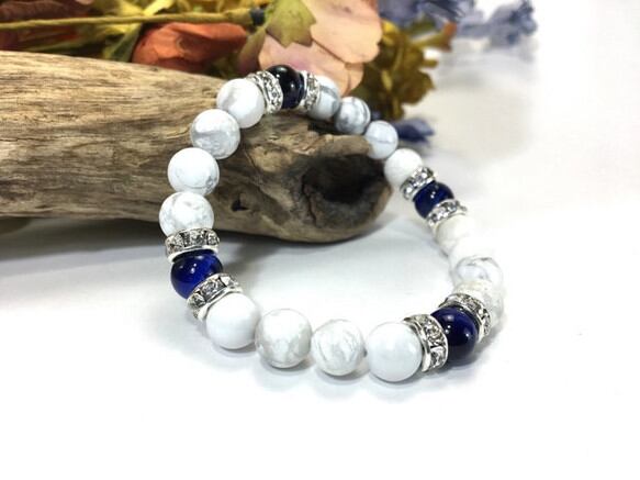 こちらは、8mm玉のブルータイガーアイとハウライトを使用したパワーストーンブレスレットです。間にはロンデルを挟み高級感ある大人っぽいデザインに仕上がっています。内径約15cmです。気になる方は是非この機会にどうぞ。