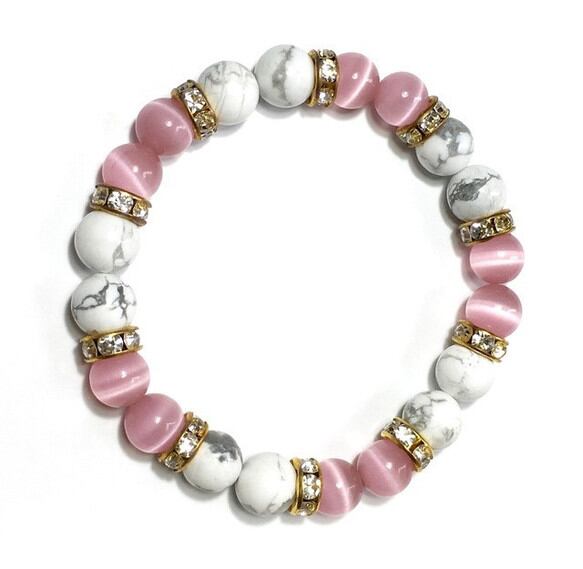 こちらは、8mm玉のピンクキャッツアイとハウライトを使用したパワーストーンブレスレットです。間にはゴールドのロンデルを挟み高級感ある大人っぽいデザインに仕上がっています。サイズは内周約15cmです。気になる方は是非この機会にどうぞ。