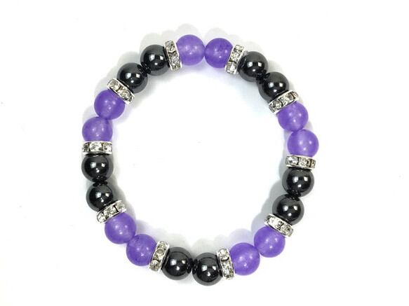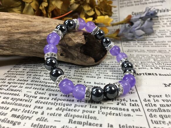 こちらは、8mm玉のジェイド(ラベンダーパープル)とヘマタイトを使用したパワーストーンブレスレットです。間にはロンデルを挟み高級感ある大人っぽいデザインに仕上がっています。サイズは内周約15cmです。気になる方は是非この機会にどうぞ。