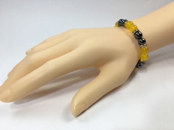 こちらは、8mm玉のジェイド(イエロー)とヘマタイトを使用したパワーストーンブレスレットです。間にはロンデルを挟み高級感ある大人っぽいデザインに仕上がっています。サイズは内周約15cmです。気になる方は是非この機会にどうぞ。