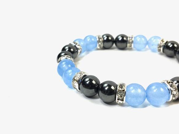 こちらは、8mm玉のジェイド(シーブルー)とヘマタイトを使用したパワーストーンブレスレットです。間にはロンデルを挟み高級感ある大人っぽいデザインに仕上がっています。サイズは内周約15cmです。気になる方は是非この機会にどうぞ。