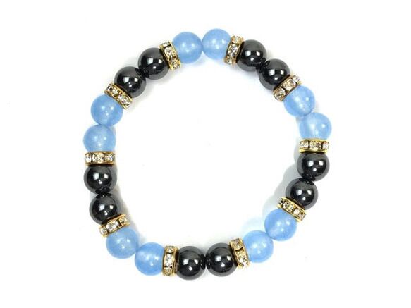 こちらは、8mm玉のジェイド(シーブルー)とヘマタイトを使用したパワーストーンブレスレットです。間にはロンデルを挟み高級感ある大人っぽいデザインに仕上がっています。サイズは内周約15cmです。気になる方は是非この機会にどうぞ。