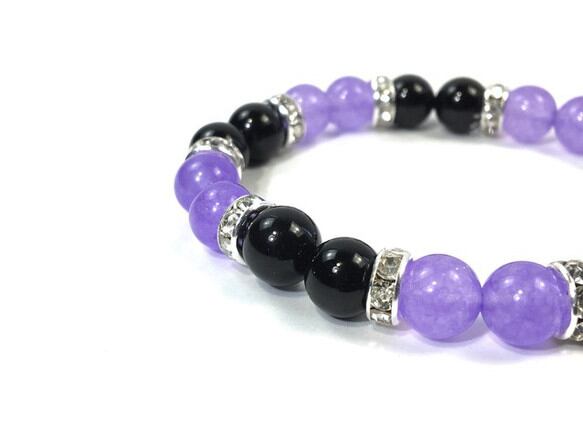 こちらは、8mm玉のジェイド(ラベンダーパープル)とオニキスを使用したパワーストーンブレスレットです。間にはロンデルを挟み高級感ある大人っぽいデザインに仕上がっています。サイズは内周約15cmです。気になる方は是非この機会にどうぞ。
