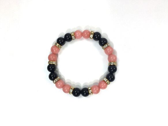こちらは、8mm玉のジェイド(ピンク)とオニキスを使用したパワーストーンブレスレットです。間にはロンデルを挟み高級感ある大人っぽいデザインに仕上がっています。サイズは内周約15cmです。気になる方は是非この機会にどうぞ。