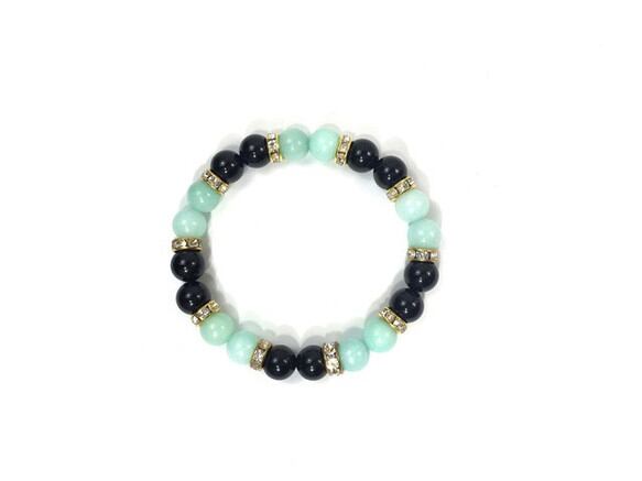 こちらは、8mm玉のジェイド(ブルーグリーン)とオニキスを使用したパワーストーンブレスレットです。間にはロンデルを挟み高級感ある大人っぽいデザインに仕上がっています。サイズは内周約15cmです。気になる方は是非この機会にどうぞ。