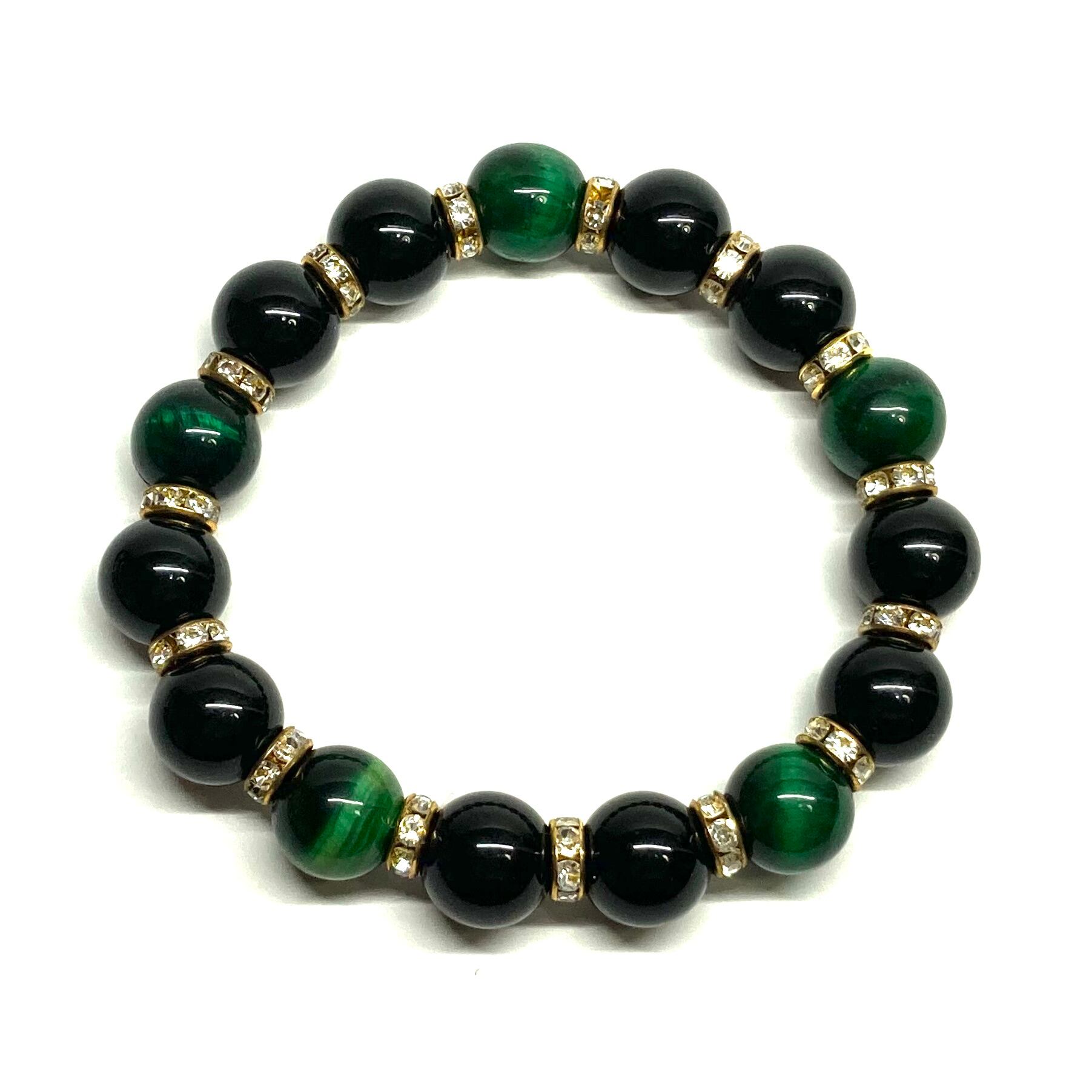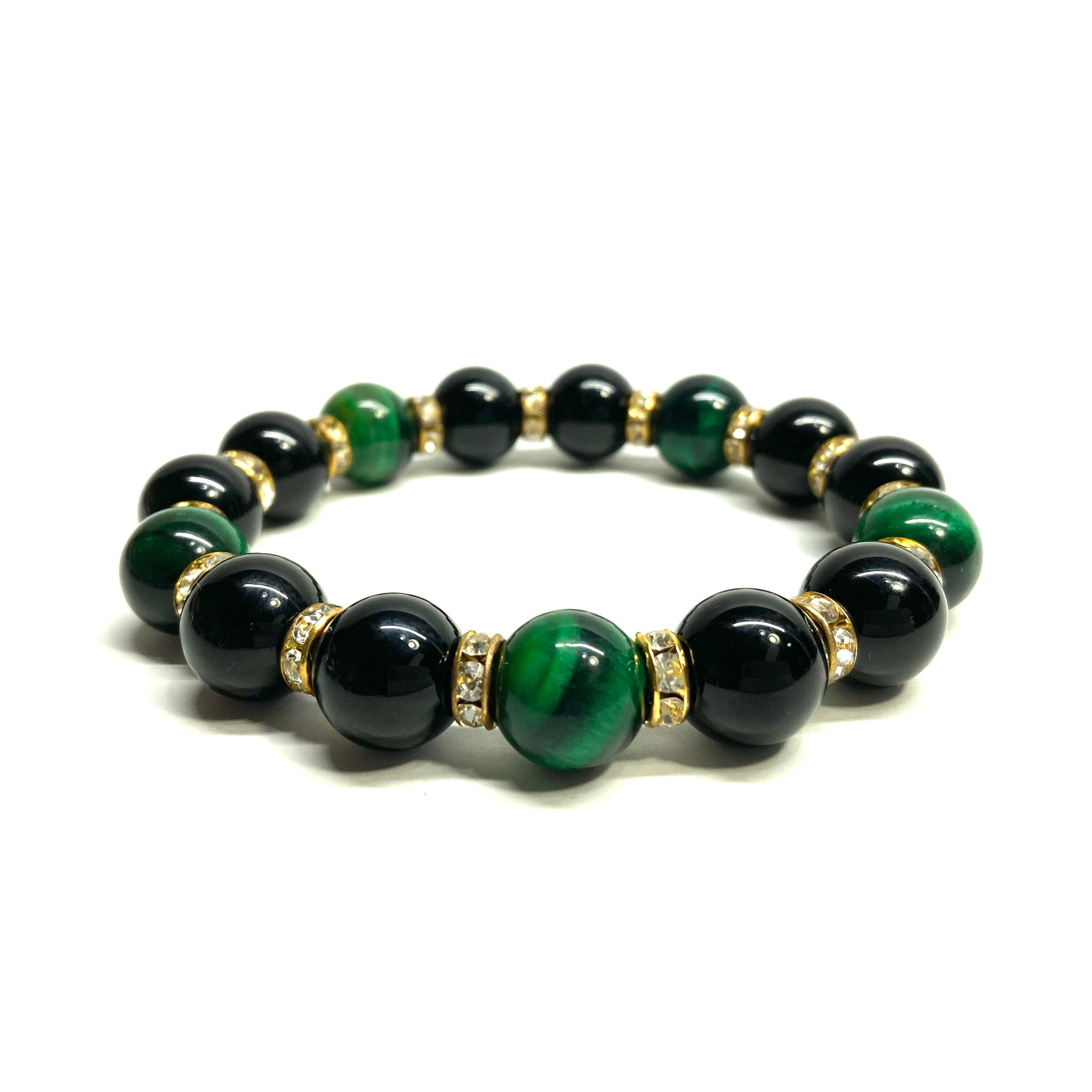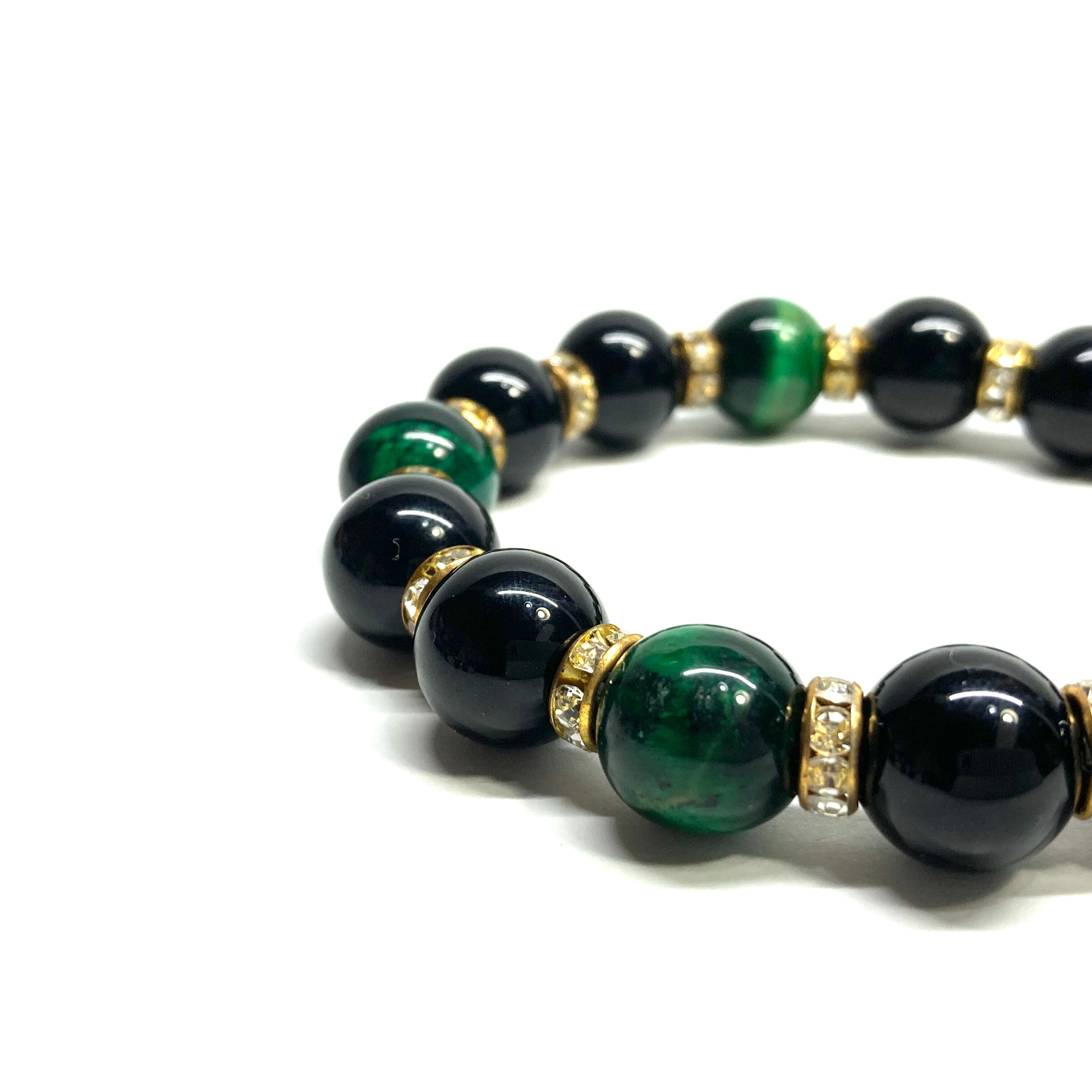モリオン&グリーンタイガーアイ パワーストーン ブレスレット 天然石ブレス (ゴールド) 12mm 幸運 開運 厄払い メンズ 男性 ☆