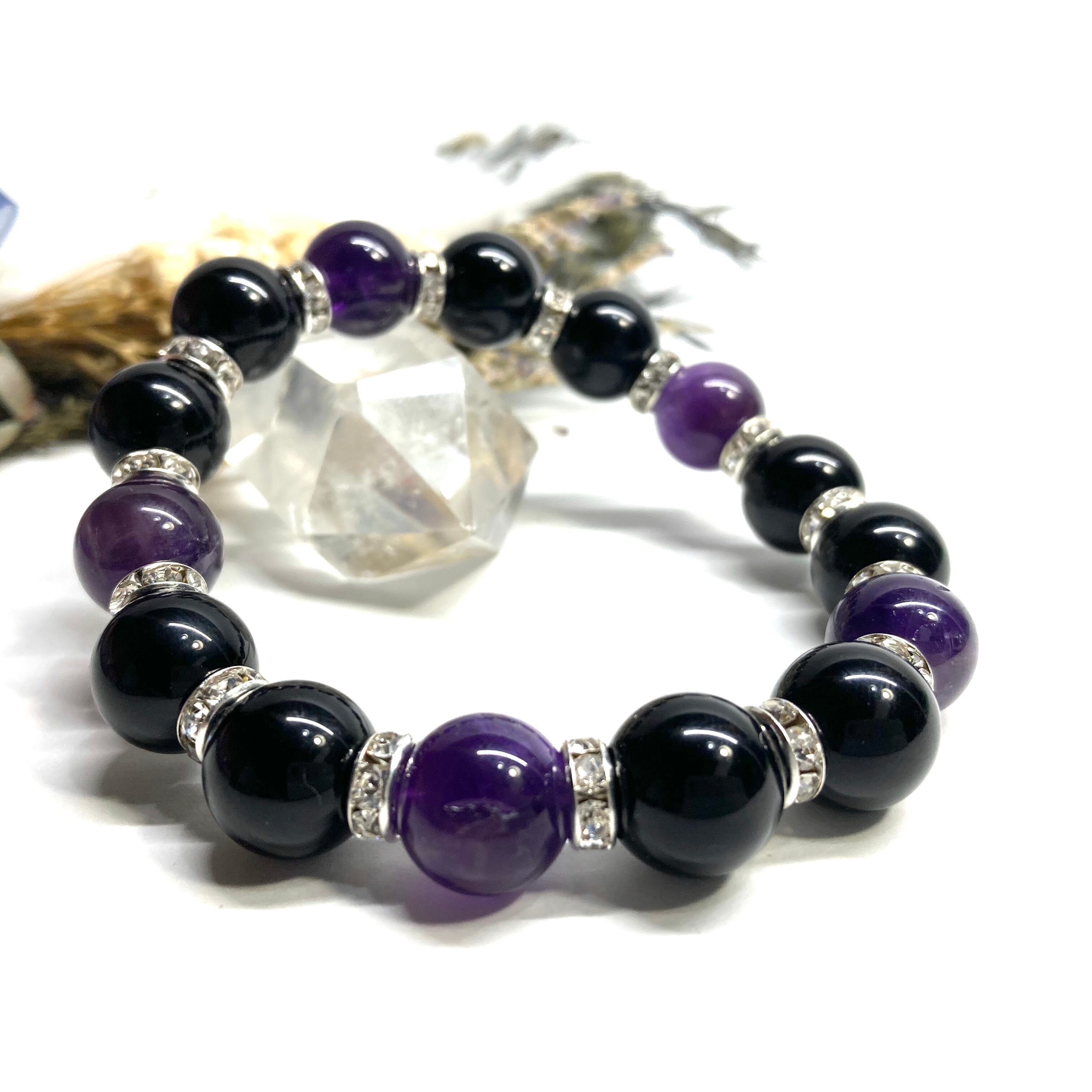 こちらは、モリオンとアメジストを組み合わせたパワーストーンブレスレットです。間にはロンデルを挟み高級感あるデザインに仕上げております。石大きさは12mm玉を使用して内周 約18cmです。気になる方は是非この機会にどうぞ。