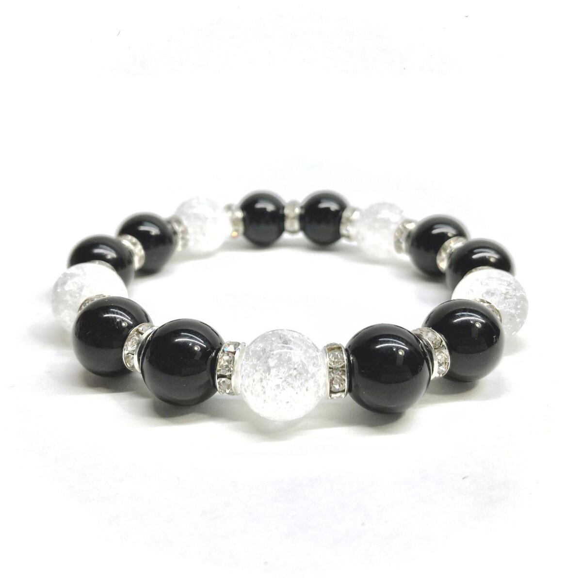 こちらは、モリオンとクラック水晶を組み合わせたパワーストーンブレスレットです。間にはロンデルを挟み高級感あるデザインに仕上げております。石大きさは12mm玉を使用して内周 約18cmです。気になる方は是非この機会にどうぞ。