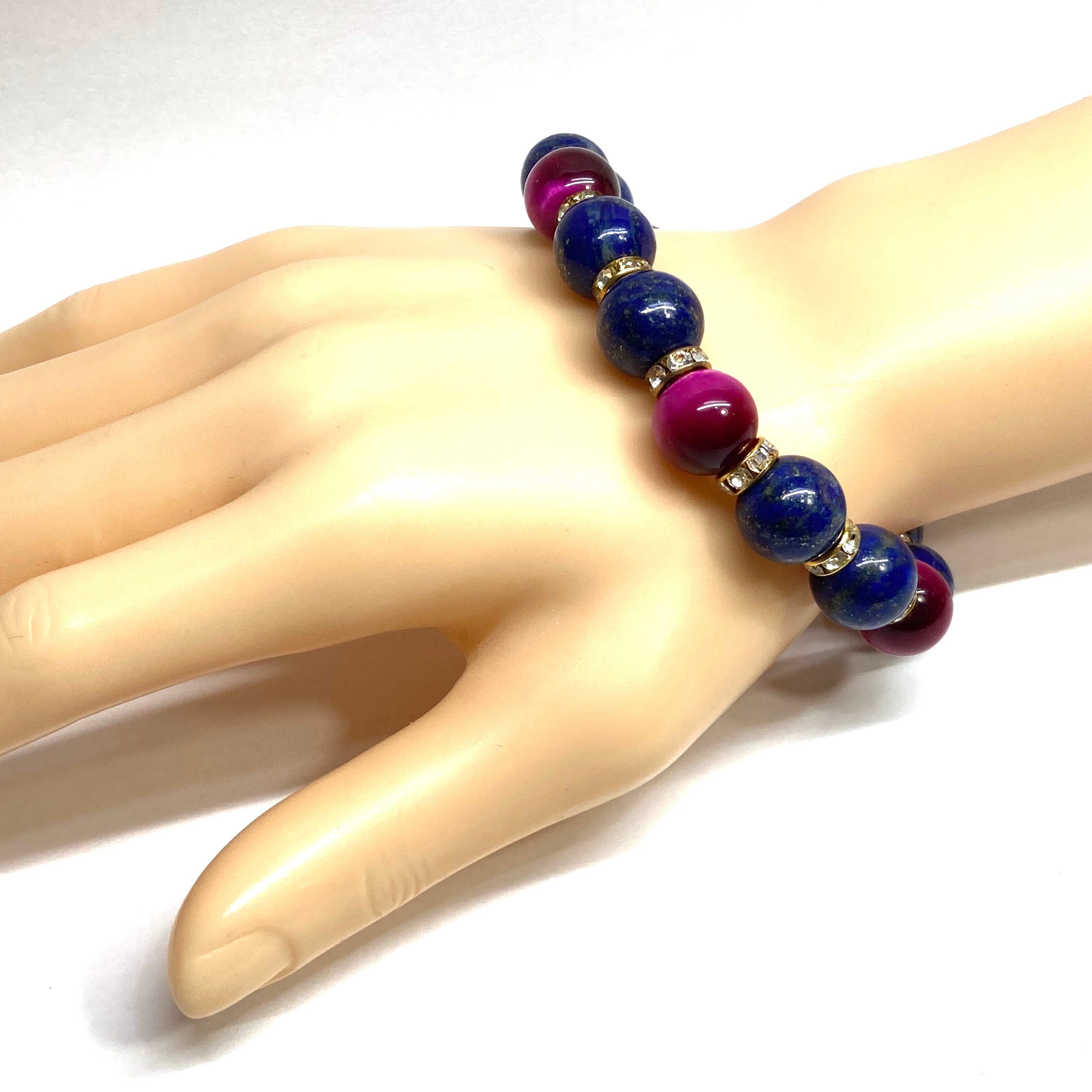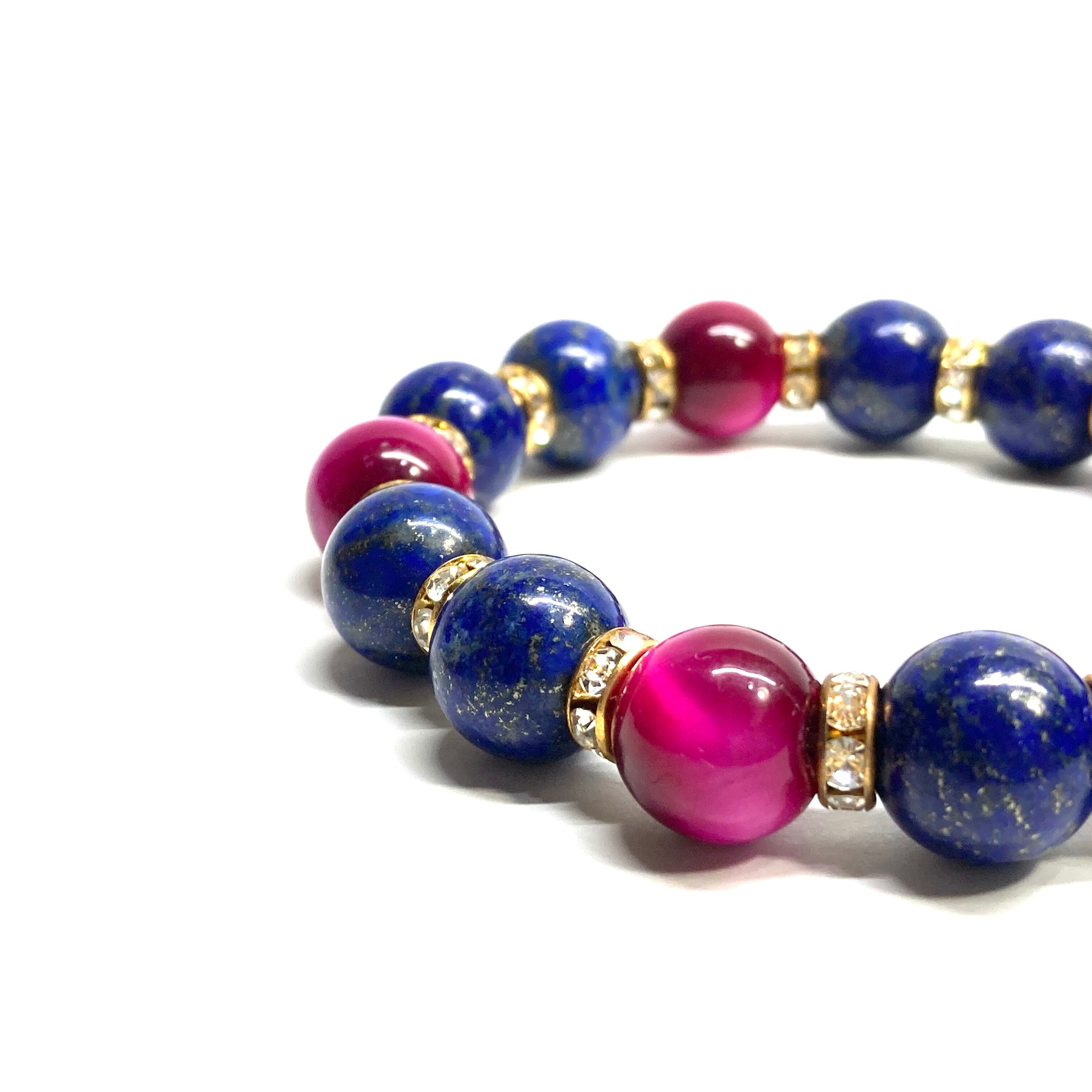 こちらは、ラピスラズリとピンクタイガーアイを組み合わせたパワーストーンブレスレットです。間にはロンデルを挟み高級感あるデザインに仕上げております。石大きさは12mm玉を使用して内周 約18cmです。気になる方は是非この機会にどうぞ。