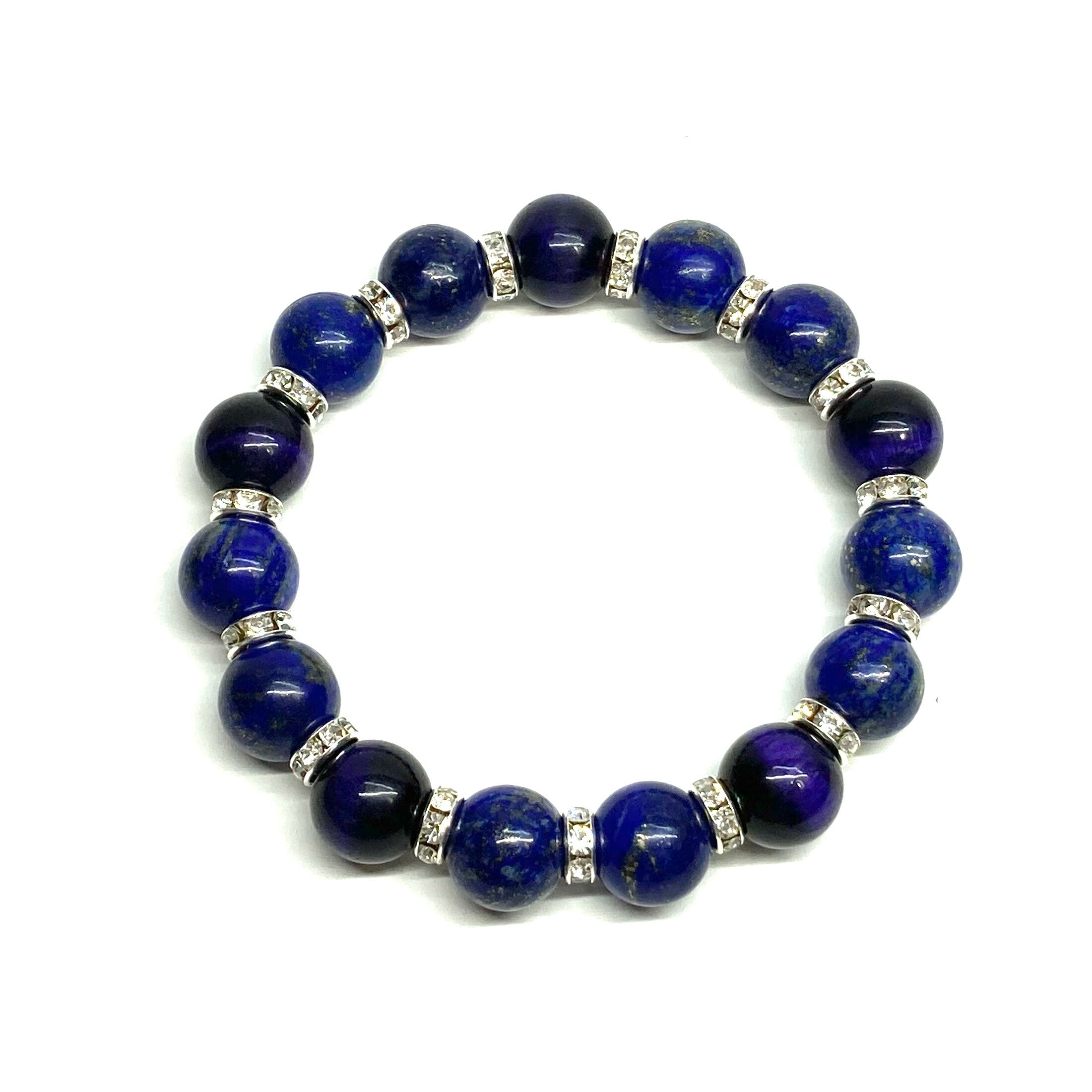 こちらは、ラピスラズリとパープルタイガーアイを組み合わせたパワーストーンブレスレットです。間にはロンデルを挟み高級感あるデザインに仕上げております。石大きさは12mm玉を使用して内周 約18cmです。気になる方は是非この機会にどうぞ。