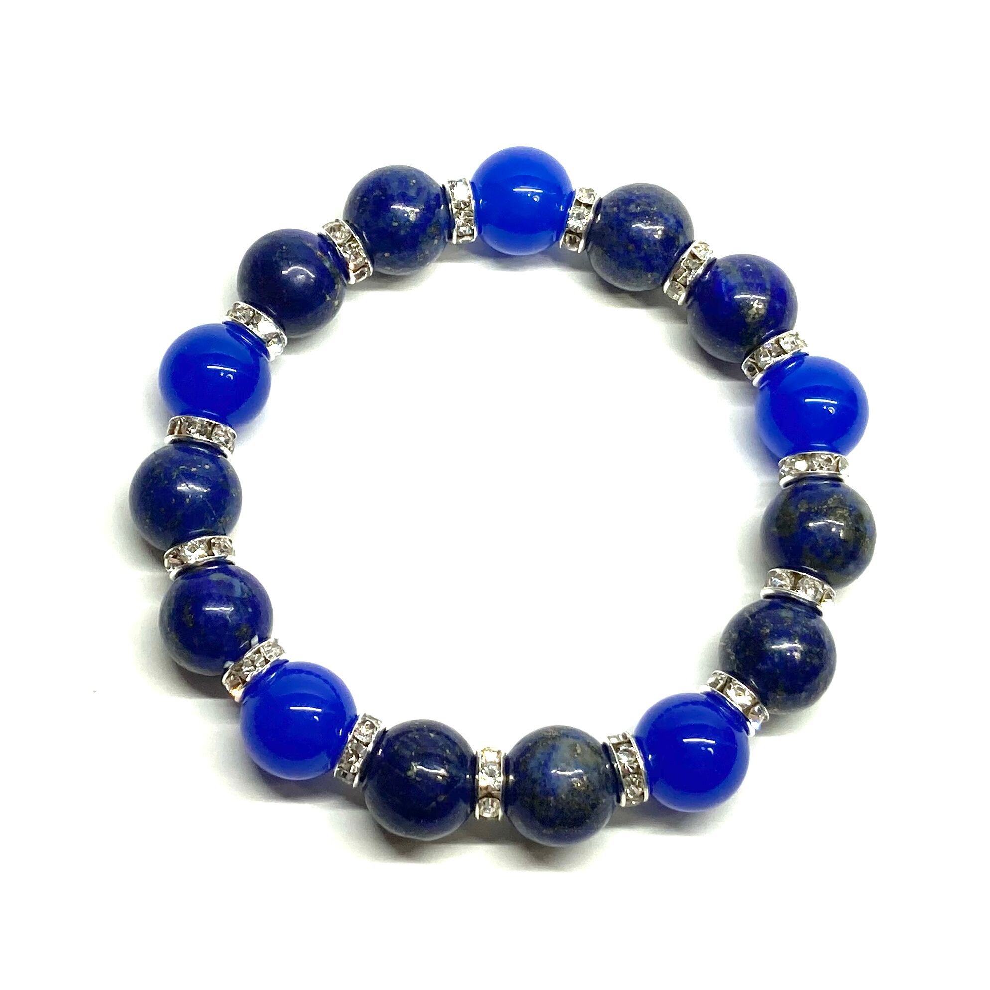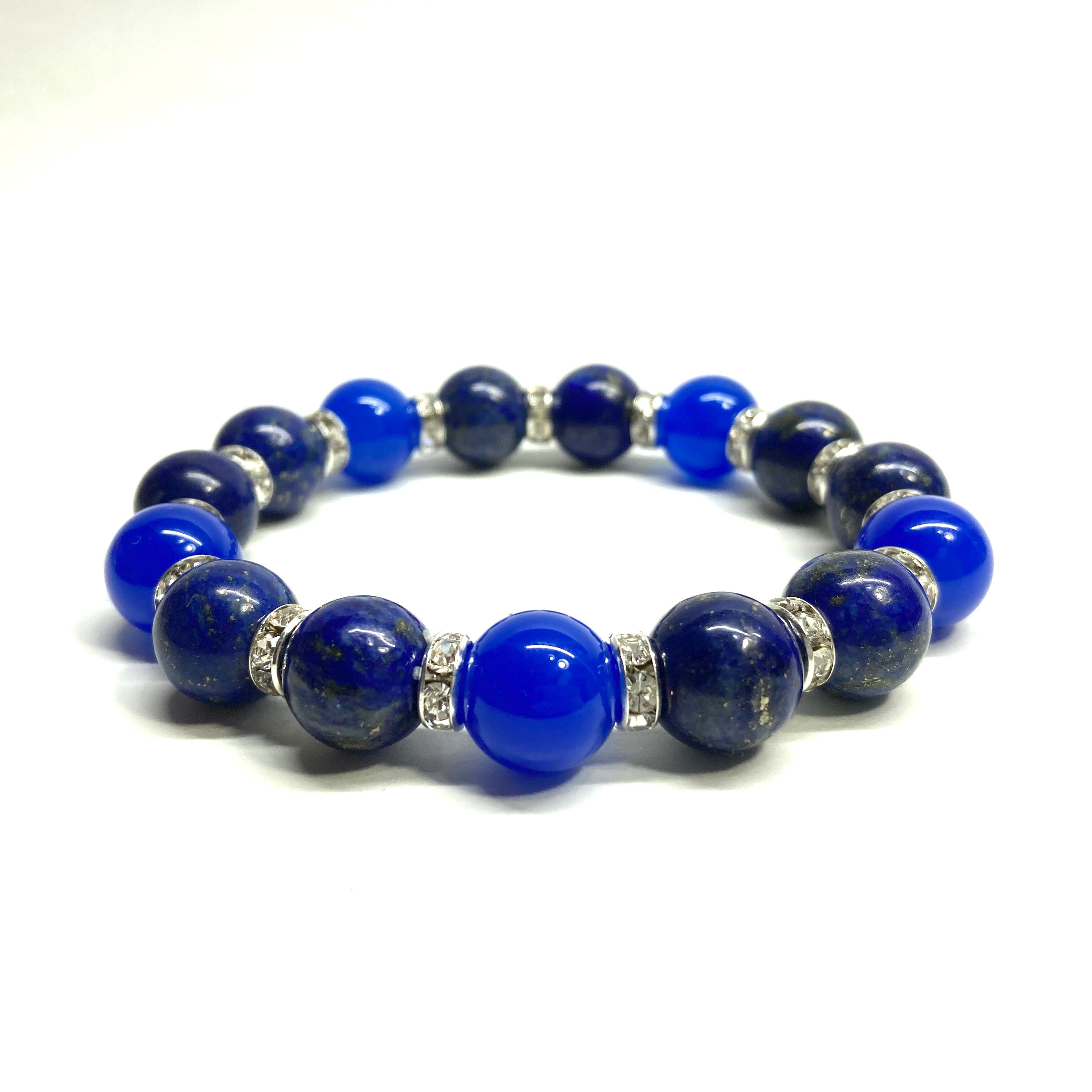 こちらは、ラピスラズリと青瑪瑙を組み合わせたパワーストーンブレスレットです。間にはロンデルを挟み高級感あるデザインに仕上げております。石大きさは12mm玉を使用して内周 約18cmです。気になる方は是非この機会にどうぞ。