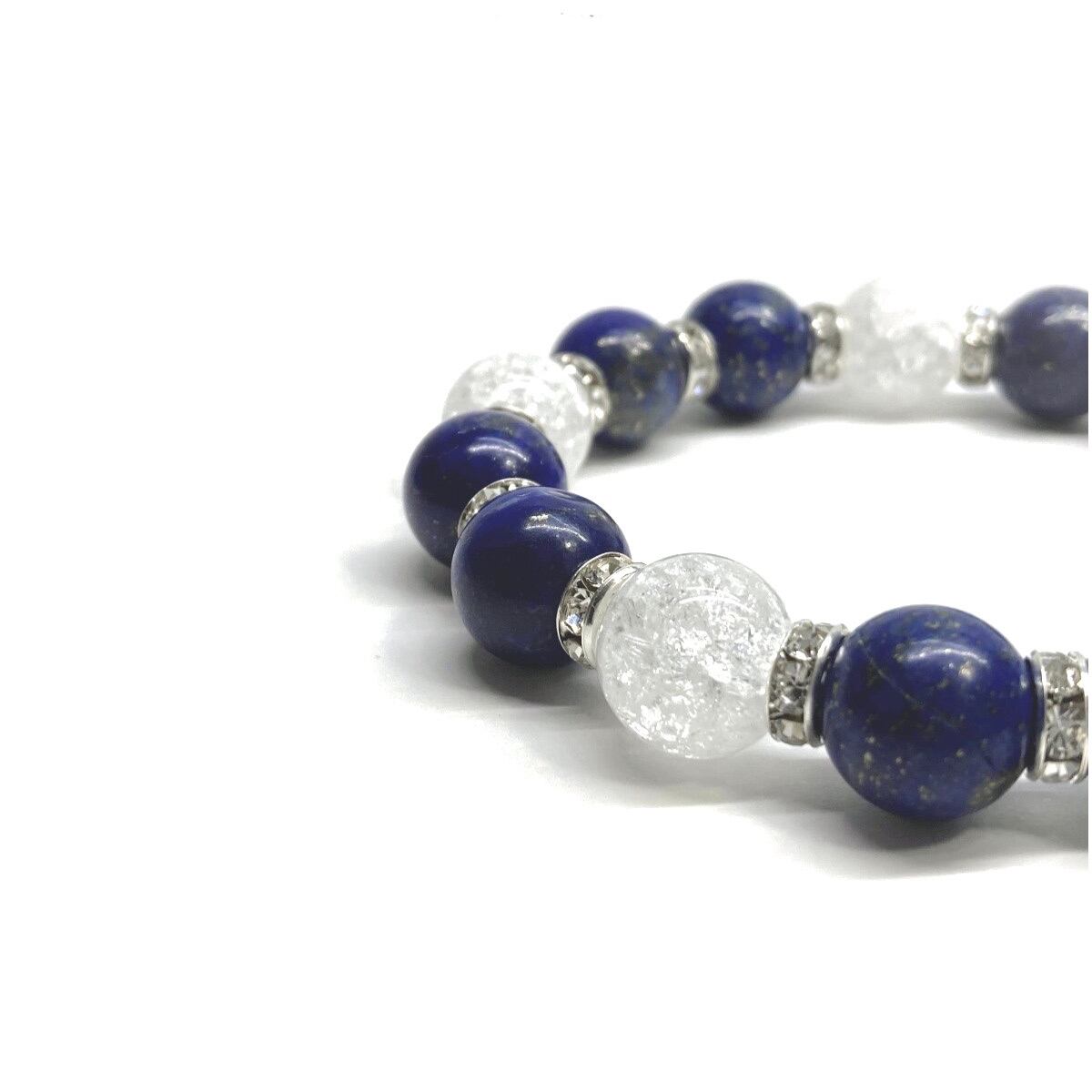 こちらは、ラピスラズリとクラック水晶を組み合わせたパワーストーンブレスレットです。間にはロンデルを挟み高級感あるデザインに仕上げております。石大きさは12mm玉を使用して内周 約18cmです。気になる方は是非この機会にどうぞ。