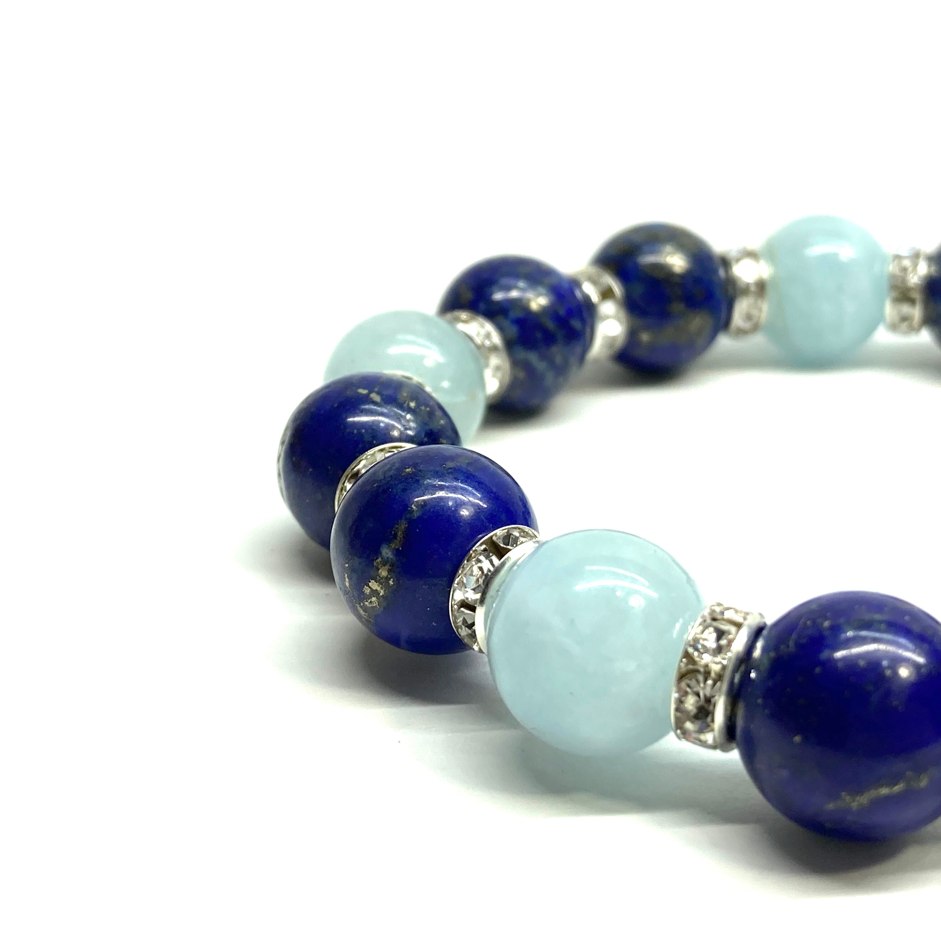 こちらは、ラピスラズリとアクアマリンを組み合わせたパワーストーンブレスレットです。間にはロンデルを挟み高級感あるデザインに仕上げております。石大きさは12mm玉を使用して内周 約18cmです。気になる方は是非この機会にどうぞ。