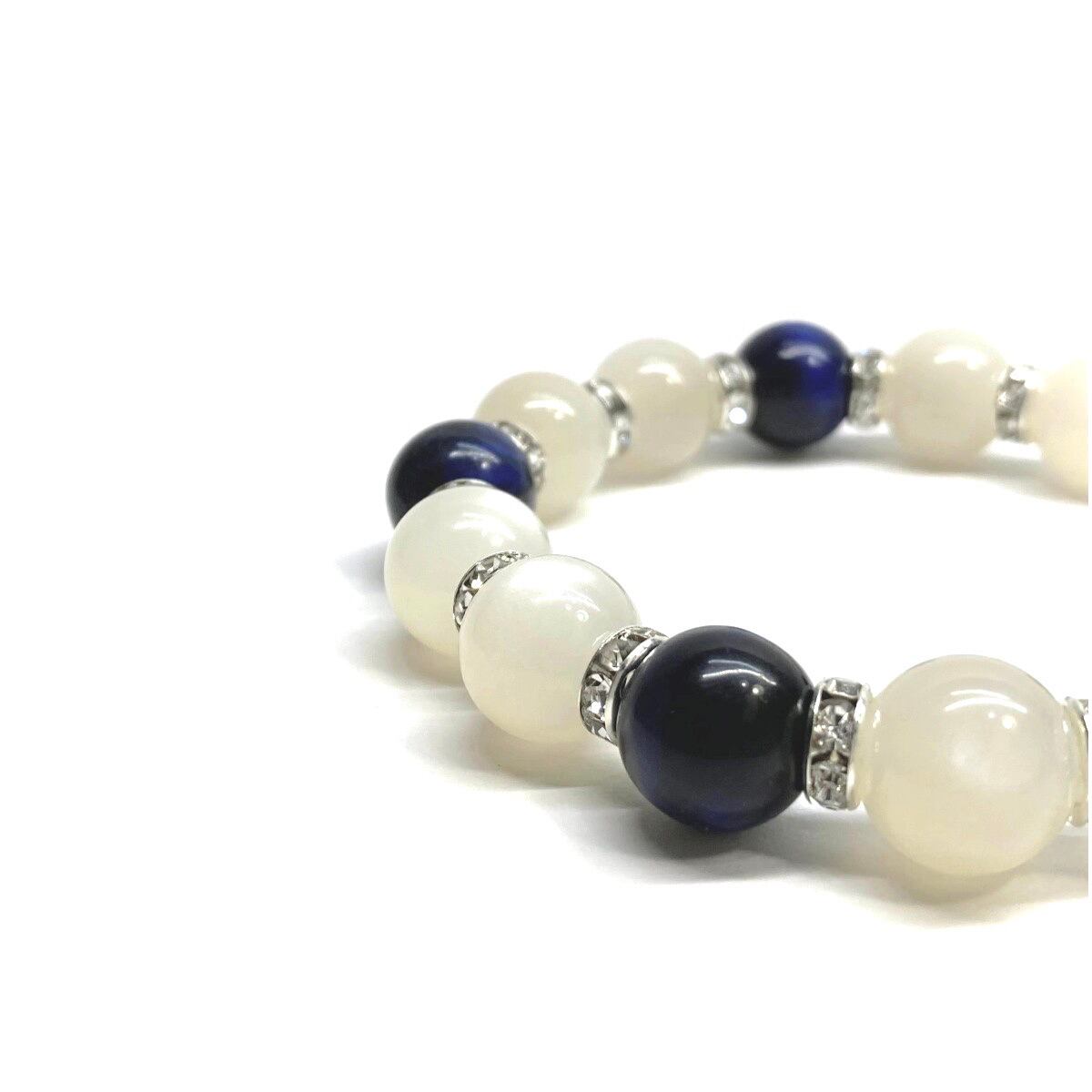 こちらは、ムーンストーンとグリーンタイガーアイを組み合わせたパワーストーンブレスレットです。間にはロンデルを挟み高級感あるデザインに仕上げております。石大きさは12mm玉を使用して内周 約18cmです。気になる方は是非この機会にどうぞ。