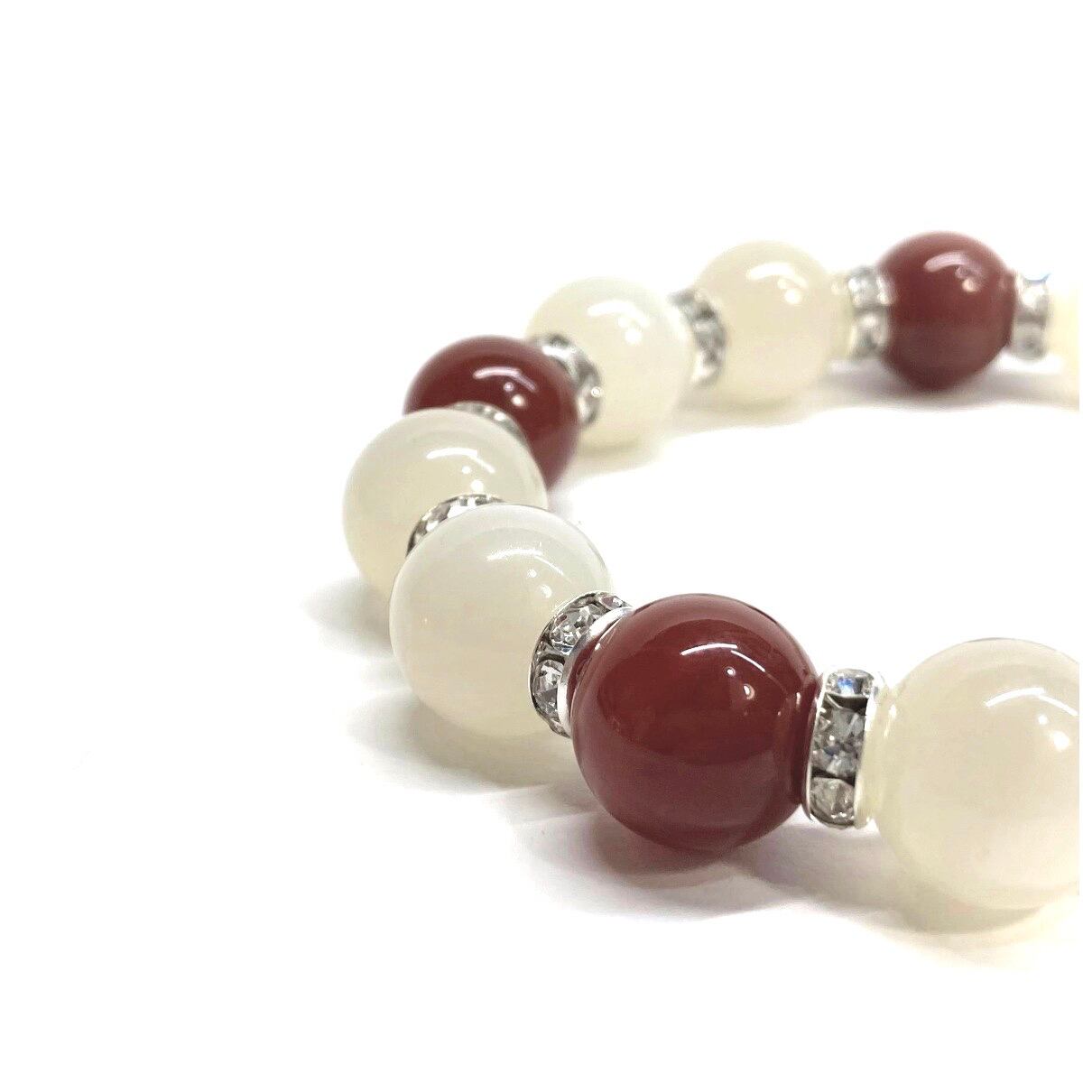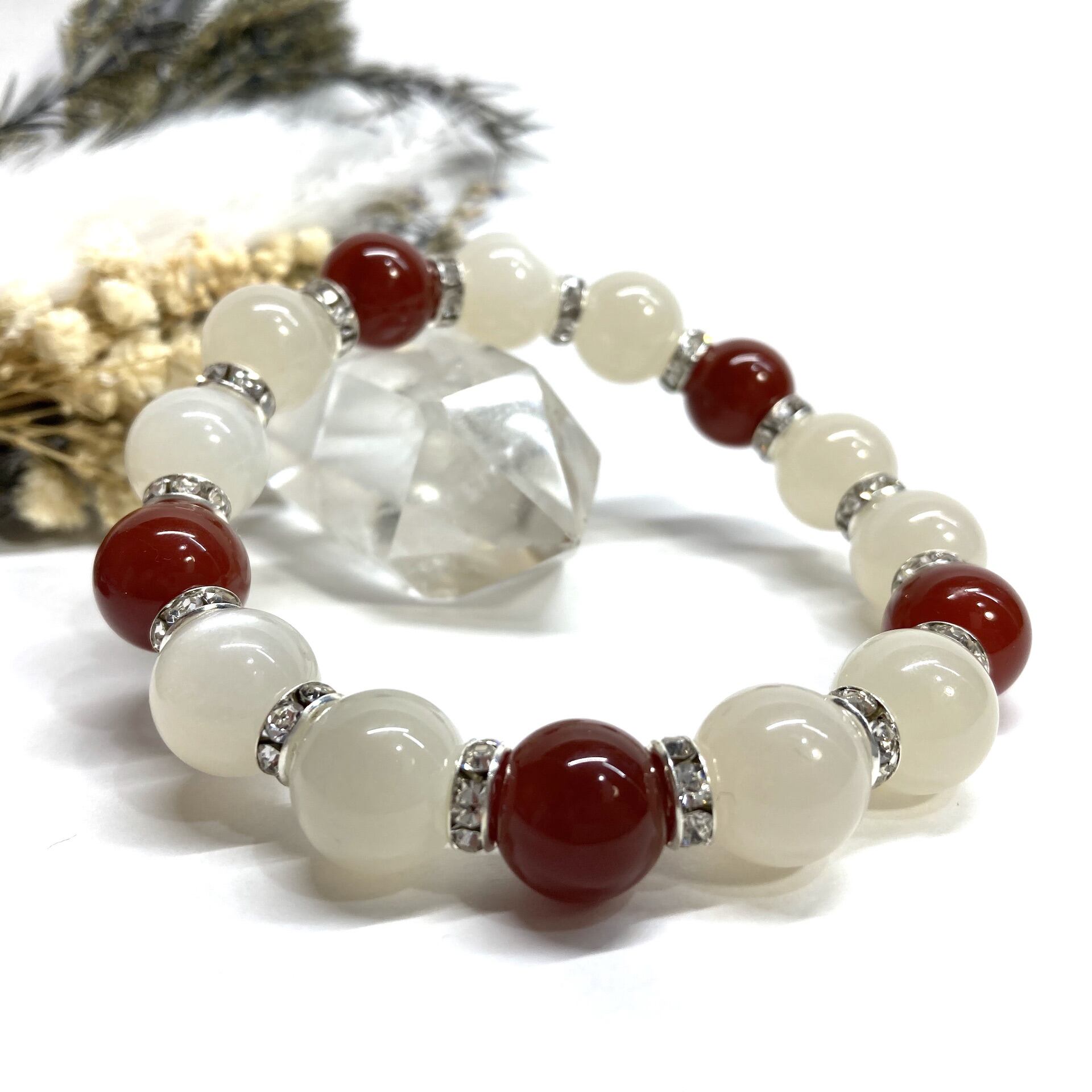 こちらは、ムーンストーンと赤瑪瑙を組み合わせたパワーストーンブレスレットです。間にはロンデルを挟み高級感あるデザインに仕上げております。石大きさは12mm玉を使用して内周 約18cmです。気になる方は是非この機会にどうぞ。