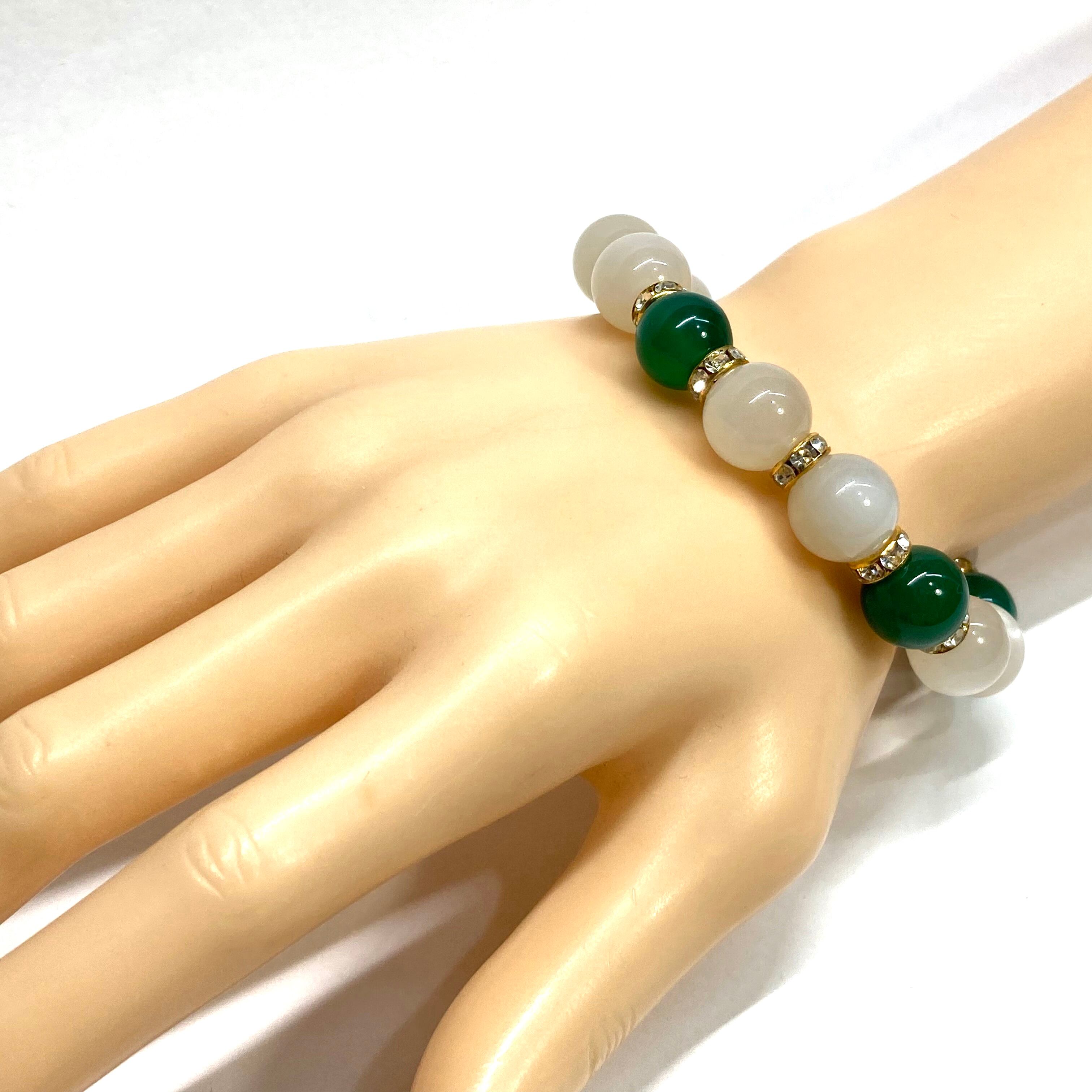 こちらは、ムーンストーンと緑瑪瑙を組み合わせたパワーストーンブレスレットです。間にはロンデルを挟み高級感あるデザインに仕上げております。石大きさは12mm玉を使用して内周 約18cmです。気になる方は是非この機会にどうぞ。