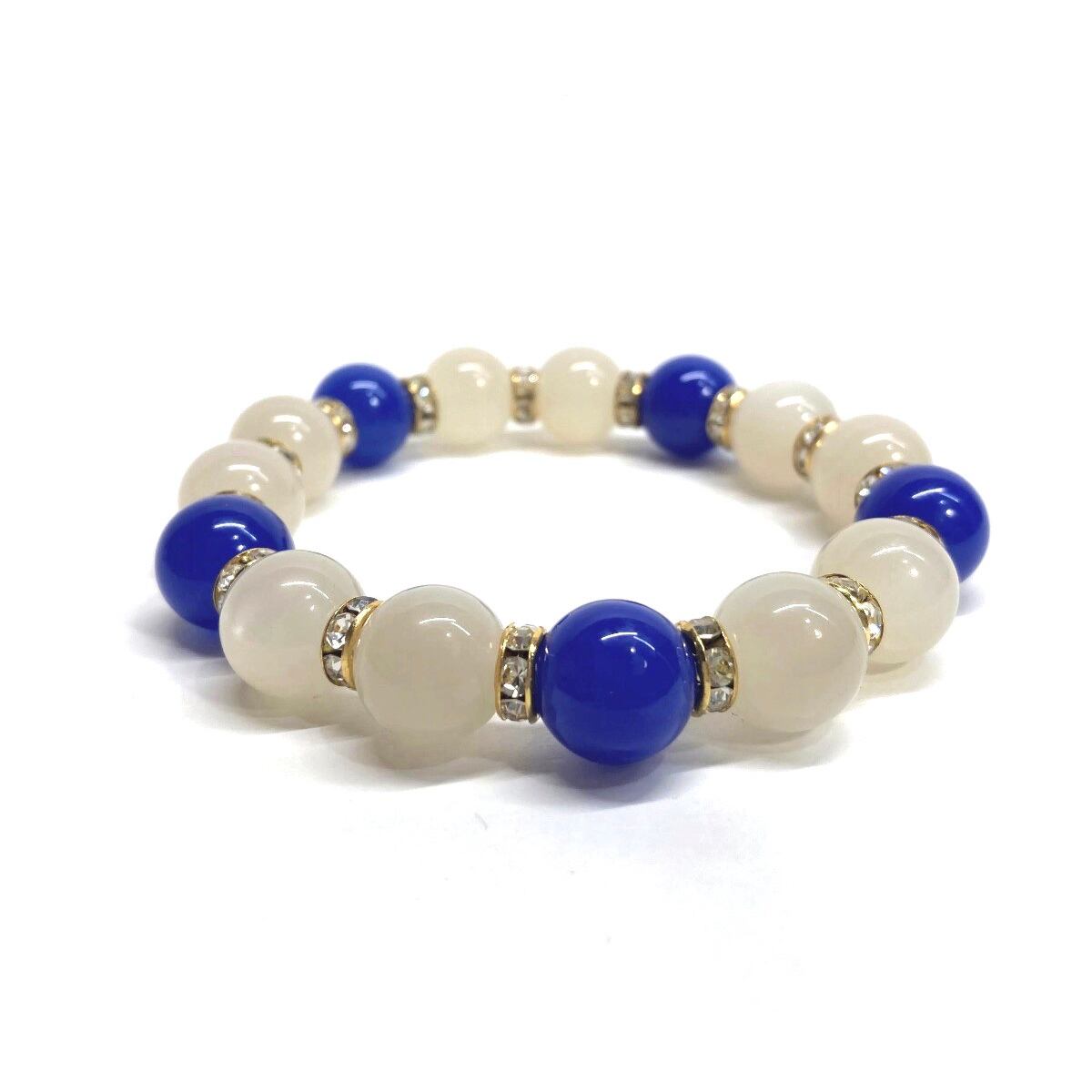 こちらは、ムーンストーンと青瑪瑙を組み合わせたパワーストーンブレスレットです。間にはロンデルを挟み高級感あるデザインに仕上げております。石大きさは12mm玉を使用して内周 約18cmです。気になる方は是非この機会にどうぞ。