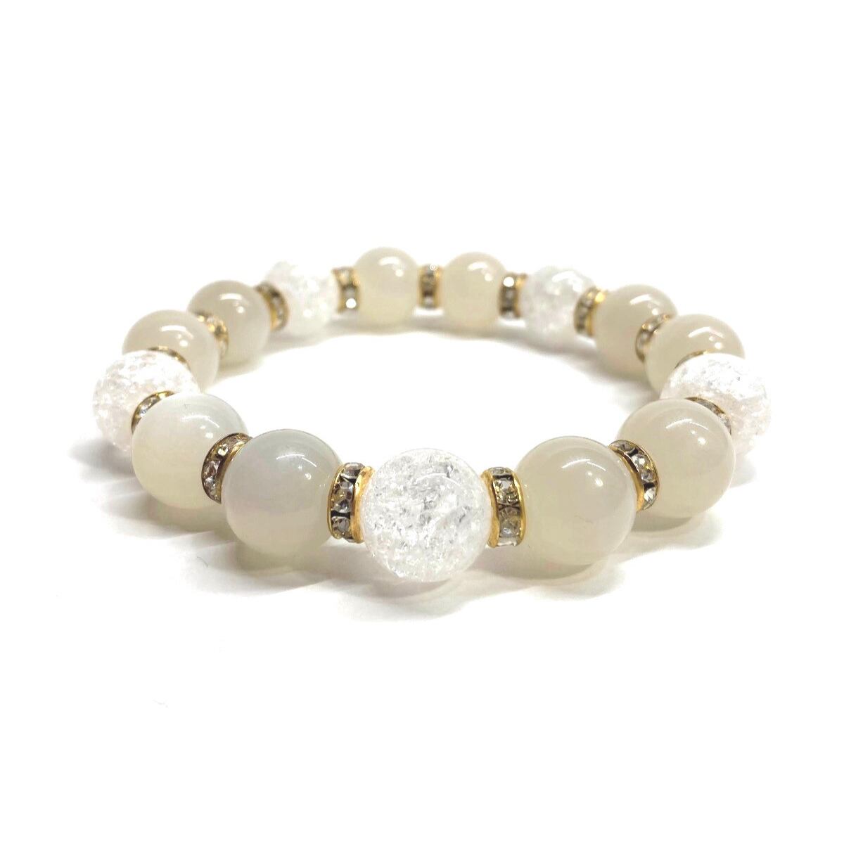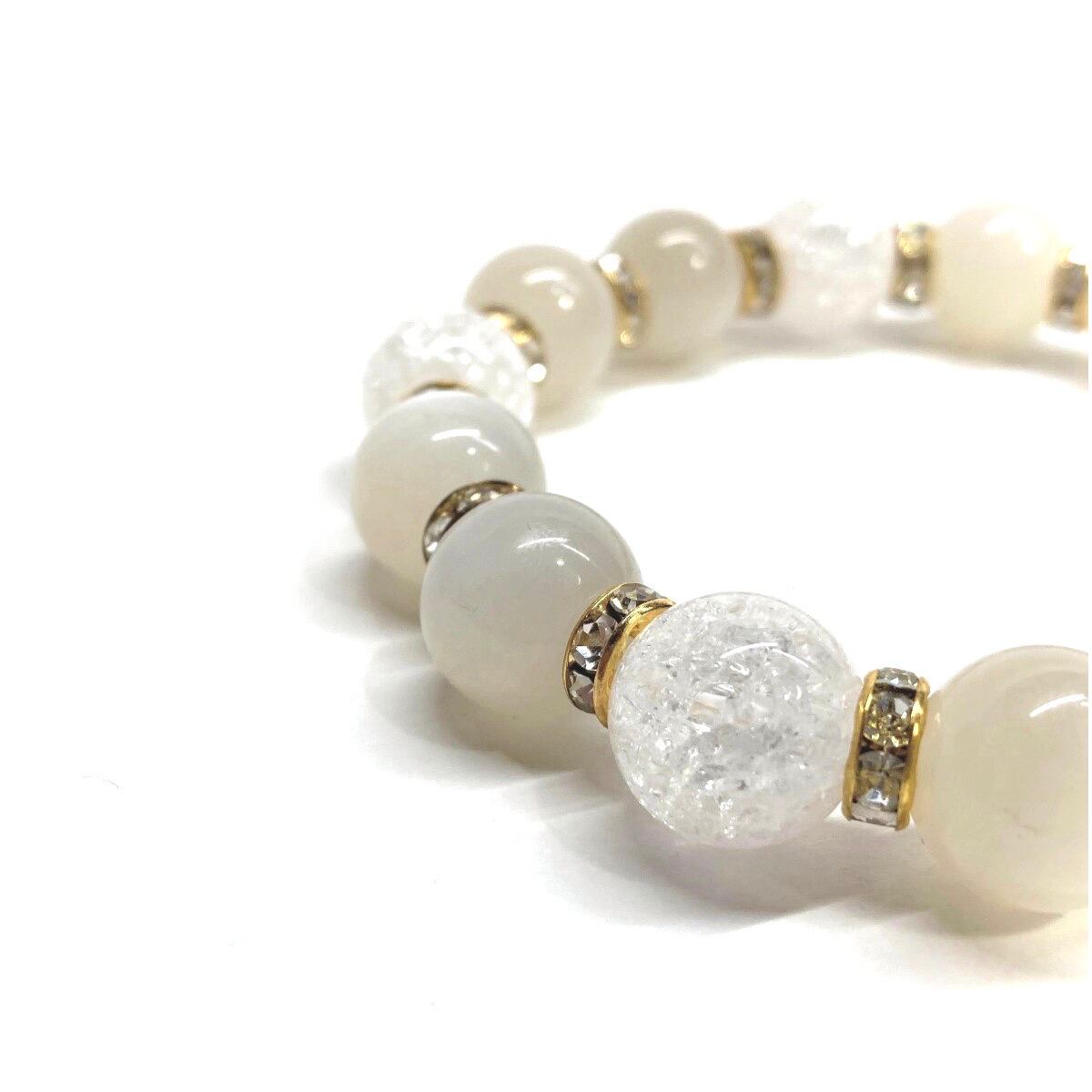 こちらは、ムーンストーンとクラック水晶を組み合わせたパワーストーンブレスレットです。間にはロンデルを挟み高級感あるデザインに仕上げております。石大きさは12mm玉を使用して内周 約18cmです。気になる方は是非この機会にどうぞ。