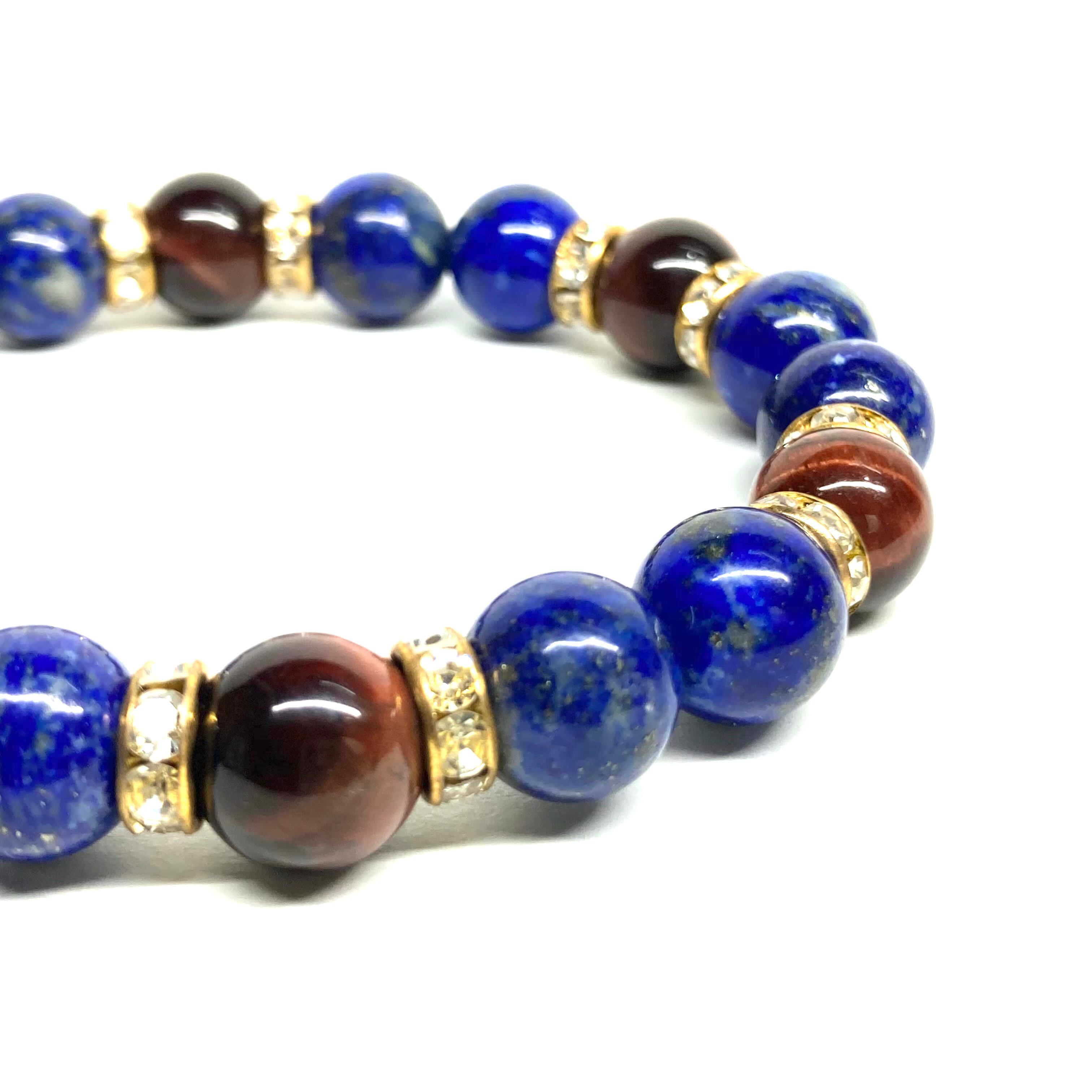 こちらは、ラピスラズリとレッドタイガーアイを組み合わせたパワーストーンブレスレットです。間にはロンデルを挟み高級感あるデザインに仕上げております。石大きさは腕にも馴染みやすいように10mm玉で内径約18cm(伸可能)です。 数に限りがございますので気になる方はお早めにどうぞ。