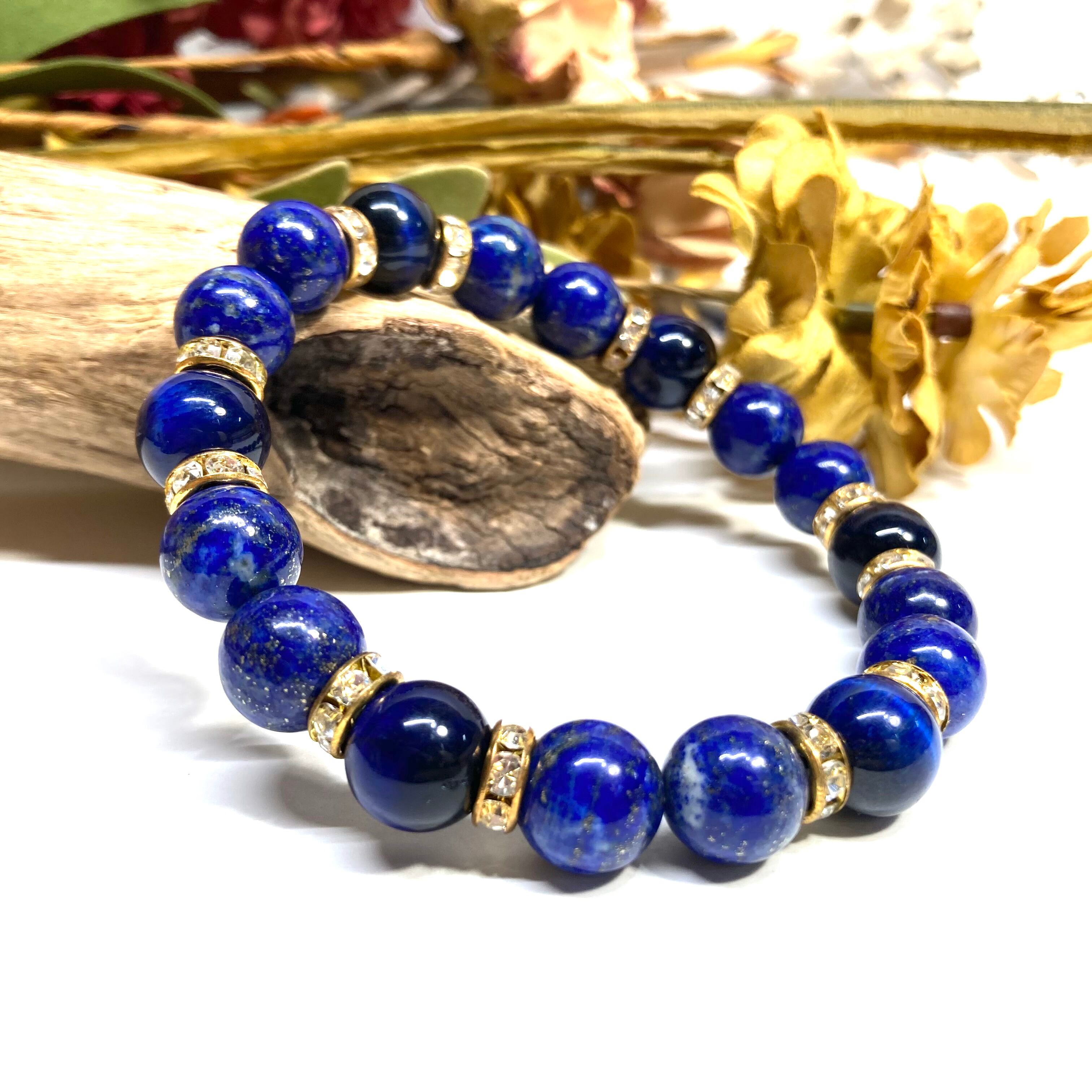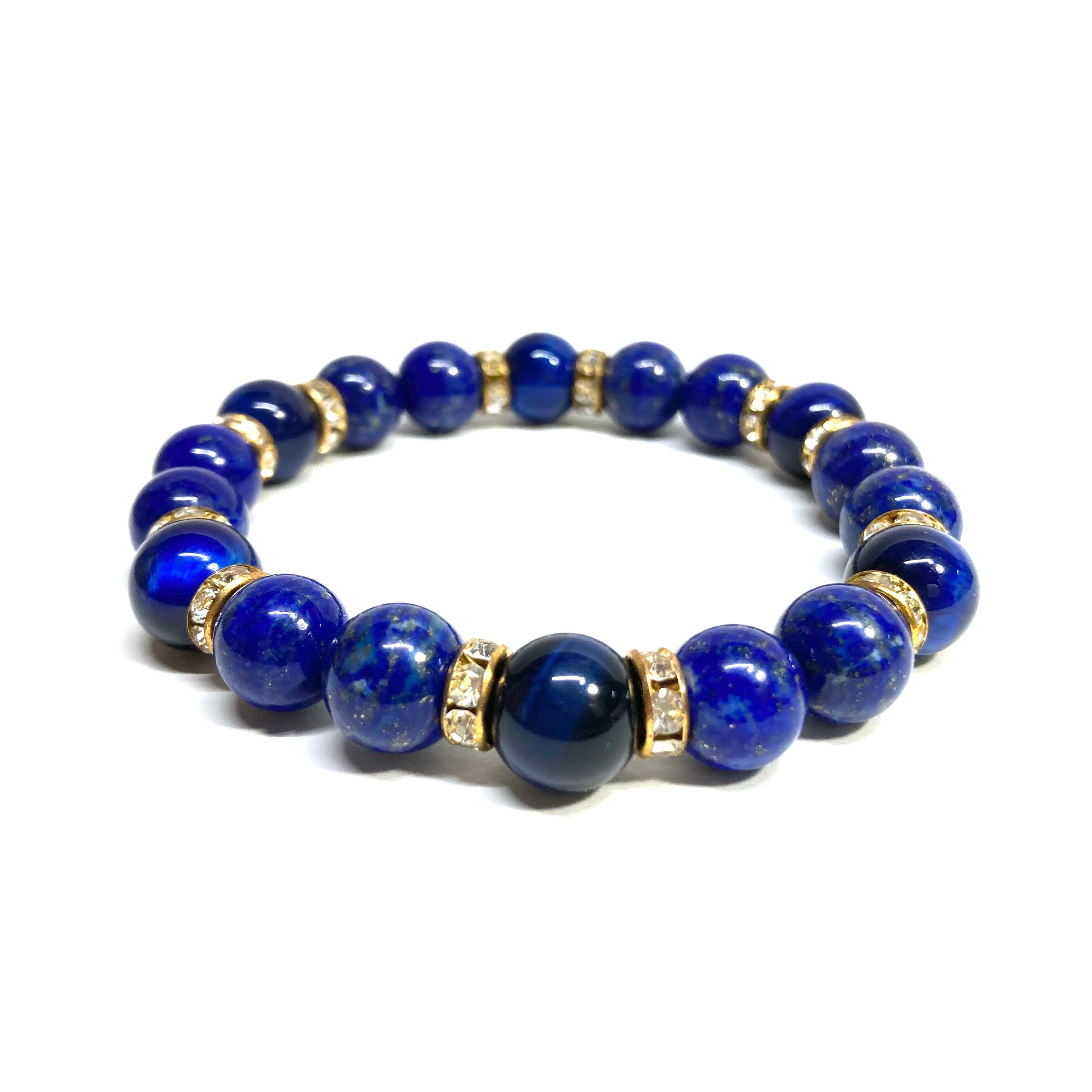 こちらは、ラピスラズリとブルータイガーアイを組み合わせたパワーストーンブレスレットです。間にはロンデルを挟み高級感あるデザインに仕上げております。石大きさは腕にも馴染みやすいように10mm玉で内径約18cm(伸可能)です。 数に限りがございますので気になる方はお早めにどうぞ。