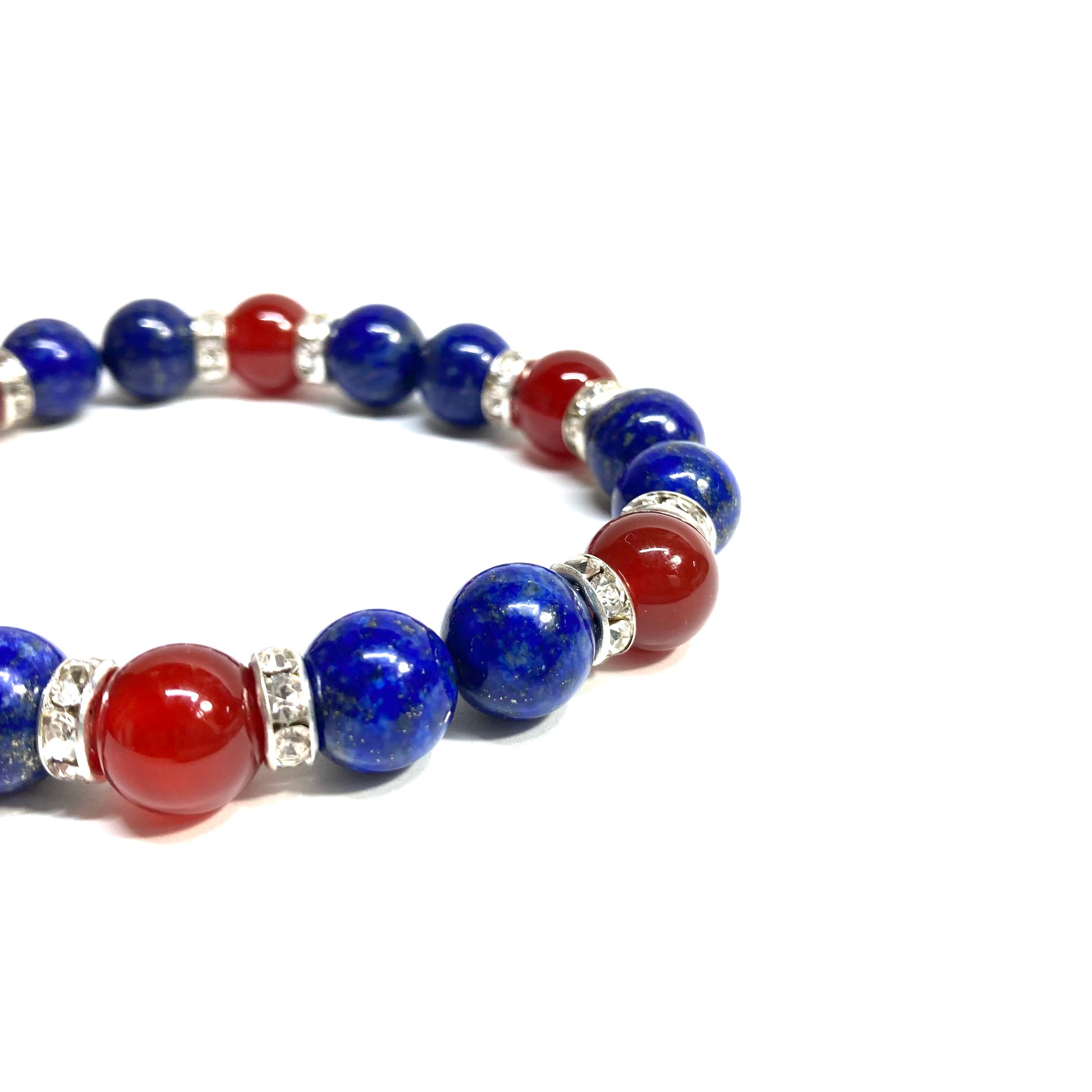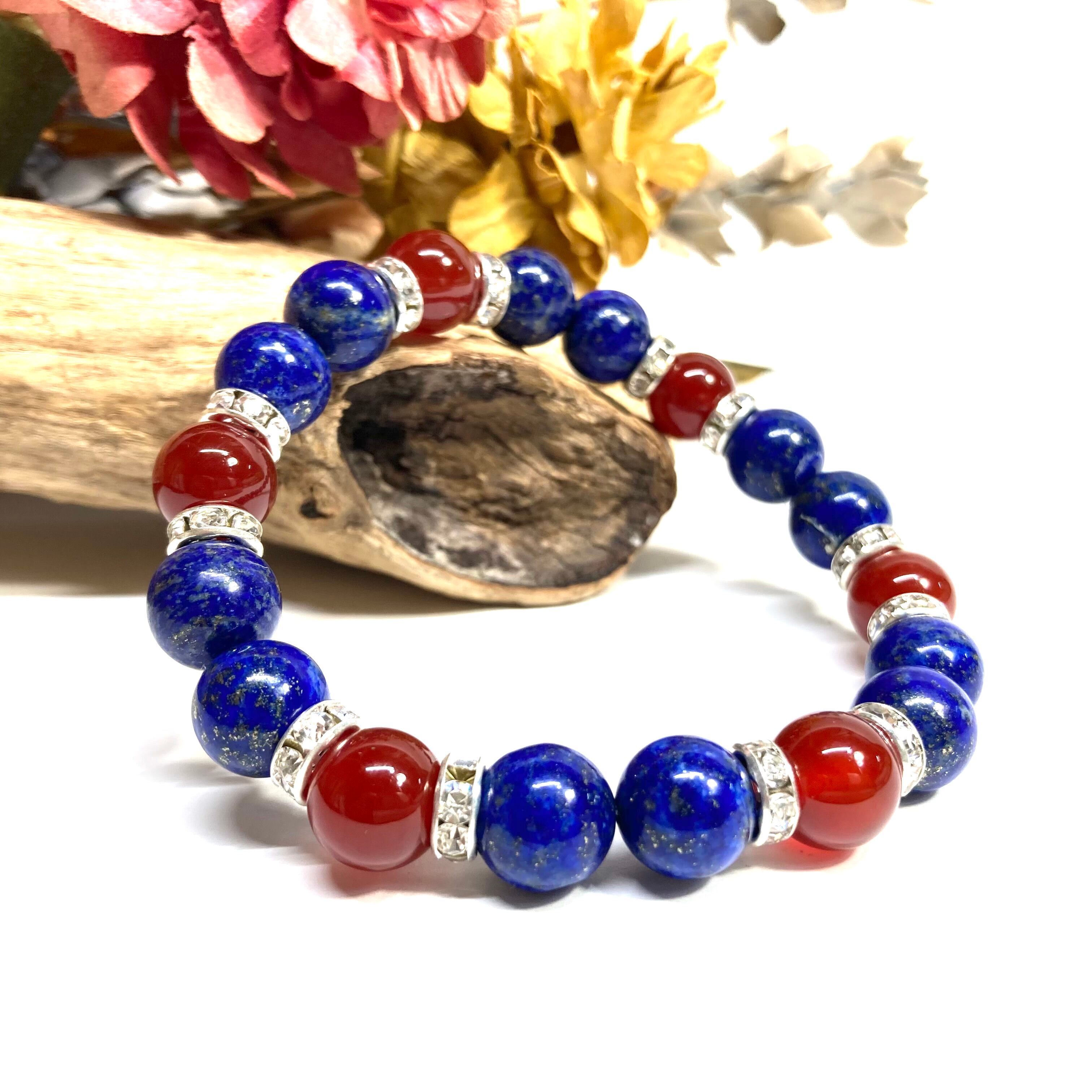 こちらは、ラピスラズリと赤瑪瑙を組み合わせたパワーストーンブレスレットです。間にはロンデルを挟み高級感あるデザインに仕上げております。石大きさは腕にも馴染みやすいように10mm玉で内径約18cm(伸可能)です。 数に限りがございますので気になる方はお早めにどうぞ。