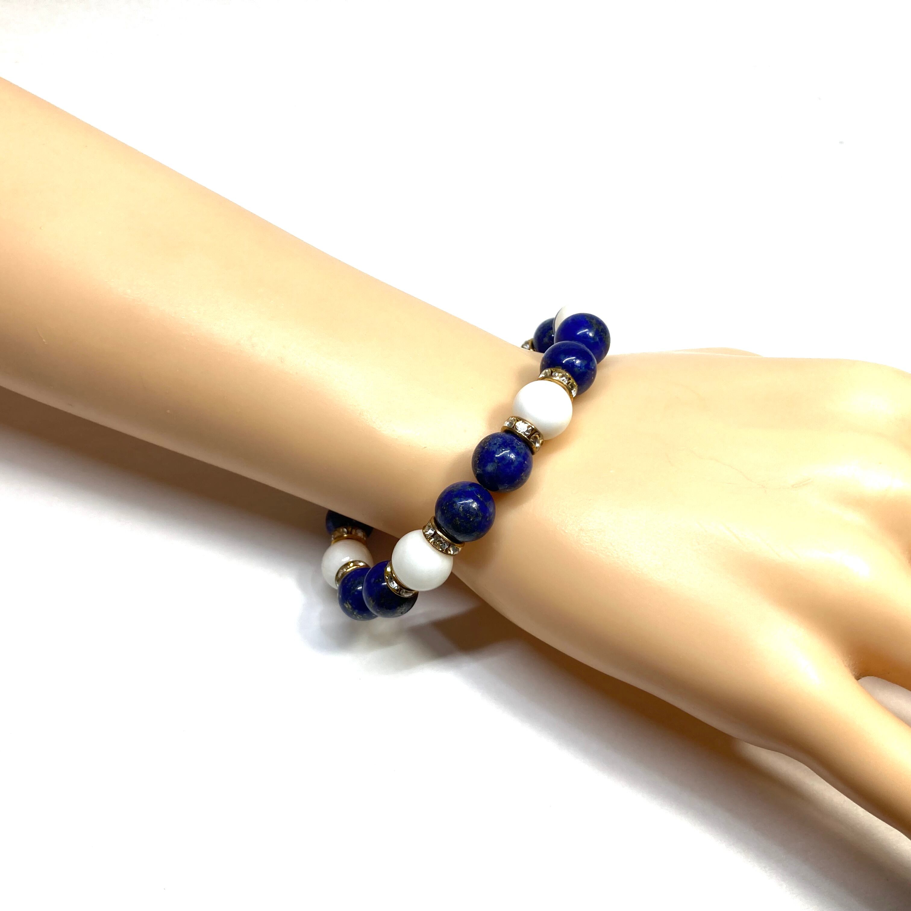 こちらは、ラピスラズリとホワイトオニキスを組み合わせたパワーストーンブレスレットです。間にはロンデルを挟み高級感あるデザインに仕上げております。石大きさは腕にも馴染みやすいように10mm玉で内径約18cm(伸可能)です。 数に限りがございますので気になる方はお早めにどうぞ。