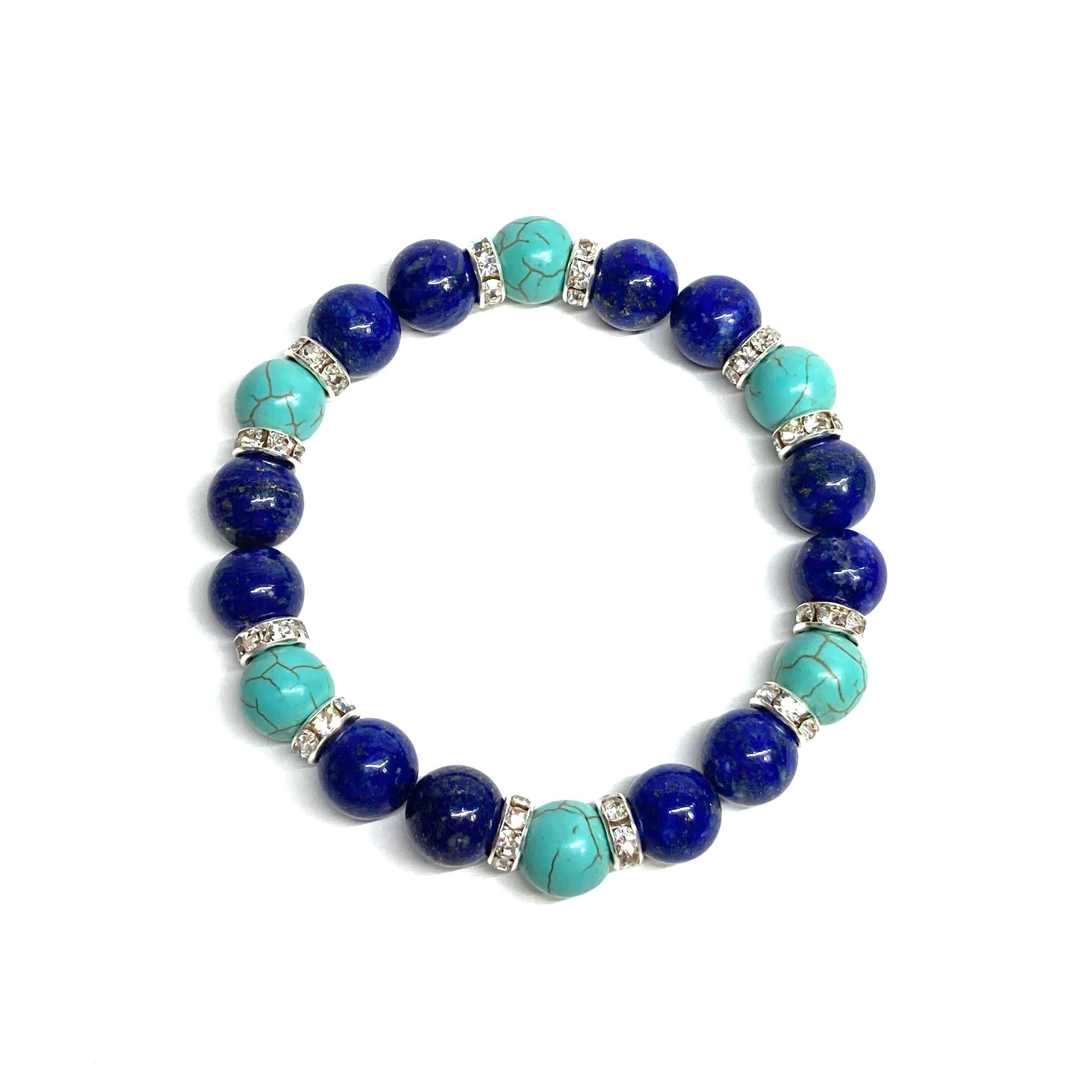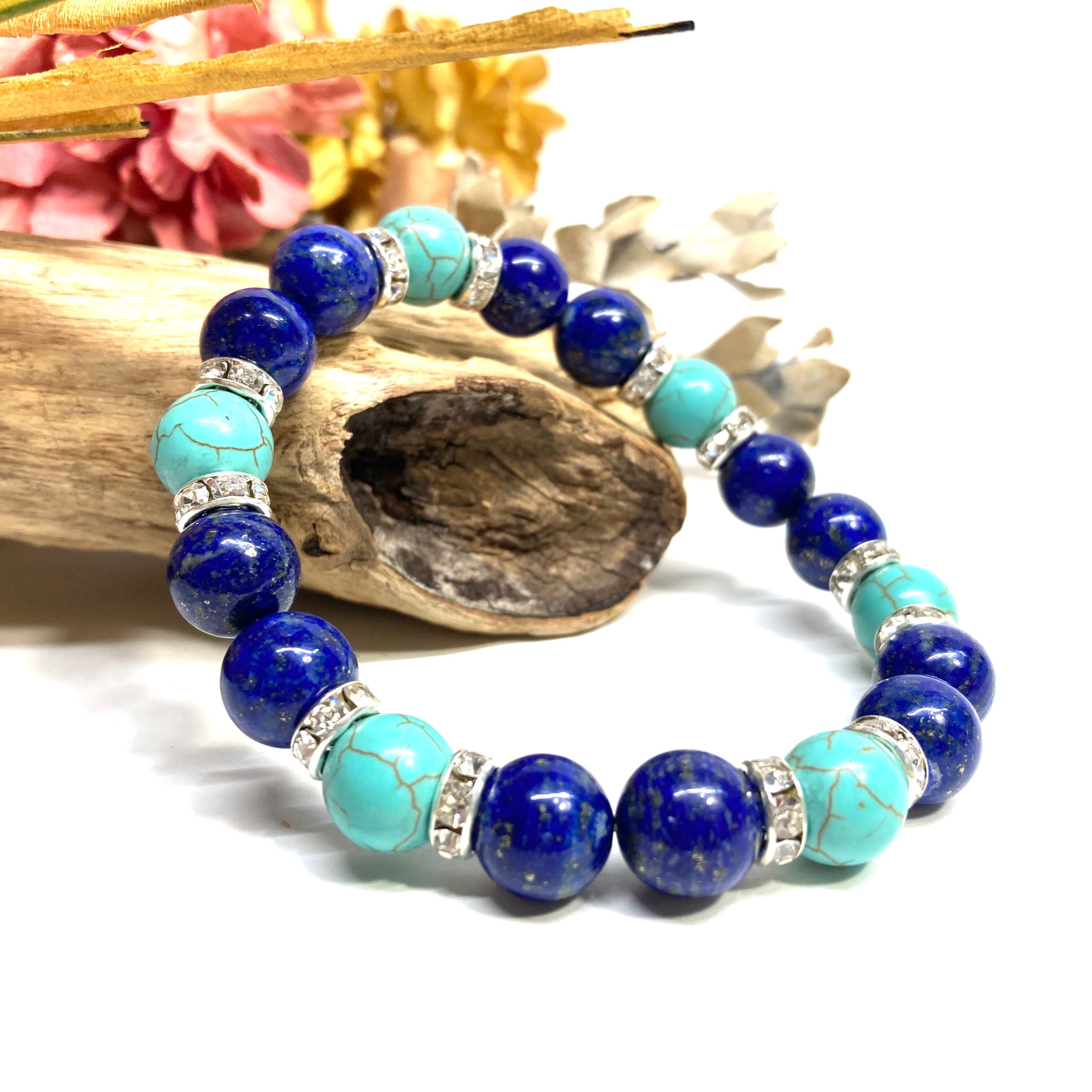 こちらは、ラピスラズリとターコイズを組み合わせたパワーストーンブレスレットです。間にはロンデルを挟み高級感あるデザインに仕上げております。石大きさは腕にも馴染みやすいように10mm玉で内径約18cm(伸可能)です。 数に限りがございますので気になる方はお早めにどうぞ。